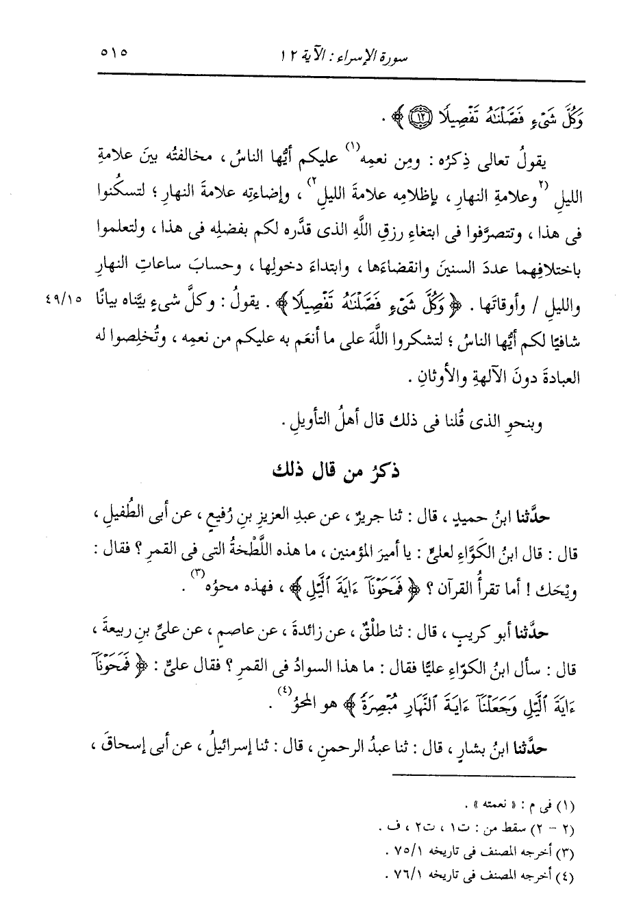 وَكُلَّ شَيْءٍ فَصَّلْنَاهُ تَفْصِيلاً} [الإسراء: 12] يَقُولُ تَعَالَى ذِكْرُهُ: وَمِنْ نِعْمَتِهِ عَلَيْكُمْ أَيُّهَا النَّاسُ، مُخَالَفَتِهِ بَيْنَ عَلَامَةِ اللَّيْلِ وَعَلَامَةِ النَّهَارِ، بِإِظْلَامِهِ عَلَامَةَ اللَّيْلِ، وَإِضَاءَتِهِ عَلَامَةَ النَّهَارِ، لِتَسْكُنُوا فِي هَذَا، وَتَتَصَرَّفُوا فِي ابْتِغَاءِ رِزْقِ اللَّهِ الَّذِي قَدَّرَهُ لَكُمْ بِفَضْلِهِ فِي هَذَا، وَلِتَعْلَمُوا بِاخْتِلَافِهِمَا عَدَدَ السِّنِينَ وَانْقِضَاءَهَا، وَابْتِدَاءَ دُخُولِهَا، وَحِسَابَ سَاعَاتِ النَّهَارِ وَاللَّيْلِ وَأَوْقَاتِهَا. {وَكُلَّ شَيْءٍ فَصَّلْنَاهُ تَفْصِيلاً} [الإسراء: 12] يَقُولُ: وَكُلُّ شَيْءٍ بَيَّنَّاهُ بَيَانًا شَافِيًا لَكُمْ أَيُّهَا النَّاسُ لِتَشْكُرُوا اللَّهَ عَلَى مَا أَنْعَمَ بِهِ عَلَيْكُمْ مِنْ نِعَمِهِ، وَتُخْلِصُوا لَهُ الْعِبَادَةَ، دُونَ الْآلِهَةِ وَالْأَوْثَانِ. وَبِنَحْوِ الَّذِي قُلْنَا فِي ذَلِكَ قَالَ أَهْلُ التَّأْوِيلِ