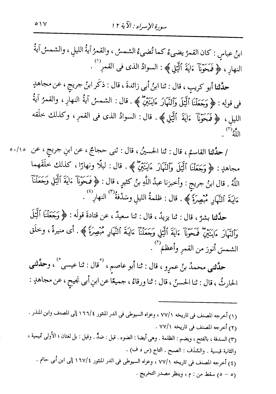 قَالَ ابْنُ جُرَيْجٍ: وَأَخْبَرَنَا عَبْدُ اللَّهِ بْنُ كَثِيرٍ، قَالَ: {§فَمَحَوْنَا آيَةَ اللَّيْلِ وَجَعَلْنَا آيَةَ النَّهَارِ مُبْصِرَةً} [الإسراء: 12] قَالَ: ظُلْمَةُ اللَّيْلِ وَسَدَفَةُ النَّهَارِ