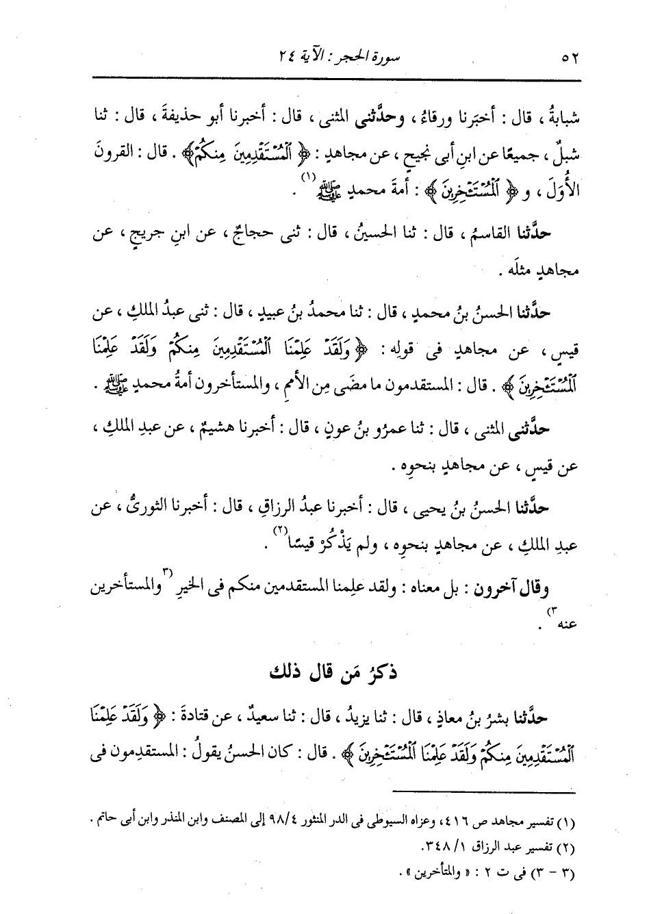 حَدَّثَنَا الْحَسَنُ بْنُ مُحَمَّدٍ قَالَ: ثنا مُحَمَّدُ بْنُ عُبَيْدٍ قَالَ: ثني عَبْدُ الْمَلِكِ، عَنْ قَيْسٍ، عَنْ مُجَاهِدٍ، فِي قَوْلِهِ: {§وَلَقَدْ عَلِمْنَا الْمُسْتَقْدِمِينَ مِنْكُمْ وَلَقَدْ عَلِمْنَا الْمُسْتَأْخِرِينَ} [الحجر: 24] قَالَ: " الْمُسْتَقْدِمُونَ: مَا مَضَى مِنَ الْأُمَمِ، وَالْمُسْتَأْخِرُونَ: أُمَّةُ مُحَمَّدٍ صَلَّى اللهُ عَلَيْهِ وَسَلَّمَ ". حَدَّثَنِي الْمُثَنَّى قَالَ: ثنا عَمْرُو بْنُ عَوْنٍ، قَالَ: أَخْبَرَنَا هُشَيْمٌ، عَنْ عَبْدِ الْمَلِكِ، عَنْ قَيْسٍ، عَنْ مُجَاهِدٍ، بِنَحْوِهِ. حَدَّثَنَا الْحَسَنُ بْنُ يَحْيَى قَالَ: أَخْبَرَنَا عَبْدُ الرَّزَّاقِ قَالَ: أَخْبَرَنَا الثَّوْرِيُّ، عَنْ عَبْدِ الْمَلِكِ، عَنْ مُجَاهِدٍ بِنَحْوِهِ، وَلَمْ يَذْكُرْ قَيْسًا. وَقَالَ آخَرُونَ: بَلْ مَعْنَاهُ: وَلَقَدْ عَلِمْنَا الْمُسْتَقْدِمِينَ مِنْكُمْ فِي الْخَيْرِ وَالْمُسْتَأْخِرِينَ عَنْهُ