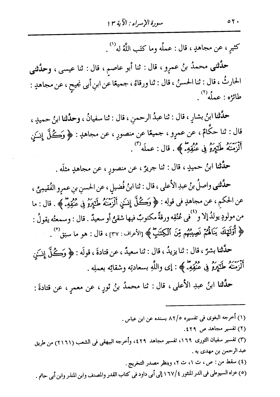 حَدَّثَنَا ابْنُ بَشَّارٍ، قَالَ: ثنا عَبْدُ الرَّحْمَنِ، قَالَ: ثنا سُفْيَانُ، وَحَدَّثَنَا ابْنُ حُمَيْدٍ، قَالَ: ثنا حَكَّامٌ، عَنْ عَمْرٍو جَمِيعًا عَنْ مَنْصُورٍ، عَنْ مُجَاهِدٍ {§وَكُلَّ إِنْسَانٍ أَلْزَمْنَاهُ طَائِرَهُ فِي عُنُقِهِ} [الإسراء: 13] قَالَ: عَمَلُهُ حَدَّثَنَا ابْنُ حُمَيْدٍ، قَالَ: ثنا جَرِيرٌ، عَنْ مَنْصُورٍ، عَنْ مُجَاهِدٍ، مِثْلَهُ.