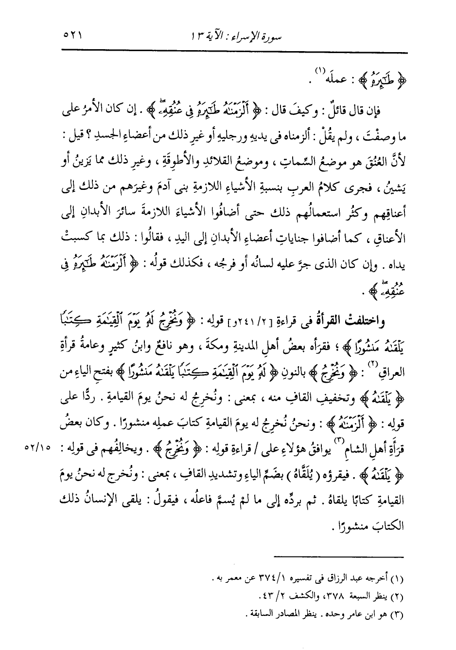 طَائِرَهُ: عَمَلُهُ فَإِنْ قَالَ قَائِلٌ: وَكَيْفَ قَالَ: أَلْزَمْنَاهُ طَائِرَهُ فِي عُنُقِهِ إِنْ كَانَ الْأَمْرُ عَلَى مَا وَصَفْتَ وَلَمْ يَقُلْ: أَلْزَمْنَاهُ فِي يَدَيْهِ وَرِجْلَيْهِ أَوْ غَيْرِ ذَلِكَ مِنْ أَعْضَاءِ الْجَسَدِ؟ قِيلَ: لِأَنَّ الْعُنُقَ هُوَ مَوْضِعُ السِّمَاتِ، وَمَوْضِعُ الْقَلَائِدِ وَالْأَطْوِقَةِ، وَغَيْرُ ذَلِكَ مِمَّا يُزَيِّنُ أَوْ يَشِينُ، فَجَرَى كَلَامُ الْعَرَبِ بِنِسْبَةِ الْأَشْيَاءِ اللَّازِمَةِ بَنِي آدَمَ وَغَيْرِهِمْ مِنْ ذَلِكَ إِلَى أَعْنَاقِهِمْ وَكَثُرَ اسْتِعْمَالُهُمْ ذَلِكَ حَتَّى أَضَافُوا الْأَشْيَاءَ اللَّازِمَةَ سَائِرَ الْأَبْدَانِ إِلَى الْأَعْنَاقِ، كَمَا أَضَافُوا جِنَايَاتِ أَعْضَاءِ الْأَبْدَانِ إِلَى الْيَدِ، فَقَالُوا: ذَلِكَ بِمَا كَسَبَتْ يَدَاهُ، وَإِنْ كَانَ الَّذِي جَرَّ عَلَيْهِ لِسَانُهُ أَوْ فَرْجُهُ، فَكَذَلِكَ قَوْلُهُ {أَلْزَمْنَاهُ طَائِرَهُ فِي عُنُقِهِ} [الإسراء: 13] وَاخْتَلَفَتِ الْقُرَّاءُ فِي قِرَاءَةِ قَوْلِهِ: {وَنُخْرِجُ لَهُ يَوْمَ الْقِيَامَةِ كِتَابًا يَلْقَاهُ مَنْشُورًا} [الإسراء: 13] فَقَرَأَهُ بَعْضُ أَهْلِ الْمَدِينَةِ وَمَكَّةَ، وَهُوَ نَافِعٌ وَابْنُ كَثِيرٍ وَعَامَّةُ قُرَّاءِ الْعِرَاقِ {وَنُخْرِجُ} [الإسراء: 13] بِالنُّونِ {لَهُ يَوْمَ الْقِيَامَةِ كِتَابًا يَلْقَاهُ مَنْشُورًا} [الإسراء: 13] بِفَتْحِ الْيَاءِ مِنْ يَلْقَاهُ وَتَخْفِيفِ الْقَافِ مِنْهُ، بِمَعْنًى: وَنُخْرِجُ لَهُ نَحْنُ يَوْمَ الْقِيَامَةِ رَدًّا عَلَى قَوْلِهِ {أَلْزَمْنَاهُ} [الإسراء: 13] وَنَحْنُ نُخْرِجُ لَهُ يَوْمَ الْقِيَامَةِ كِتَابَ عَمَلِهِ مَنْشُورًا. وَكَانَ بَعْضُ قُرَّاءِ أَهْلِ الشَّامِ يُوَافِقُ هَؤُلَاءِ عَلَى قِرَاءَةِ قَوْلِهِ {وَنُخْرِجُ} [الإسراء: 13] وَيُخَالِفُهُمْ فِي قَوْلِهِ {يَلْقَاهُ} [الإسراء: 13] فَيَقْرَؤُهُ: «يُلْقَاهُ» بِضَمِّ الْيَاءِ وَتَشْدِيدِ الْقَافِ، بِمَعْنَى: وَنُخْرِجُ لَهُ نَحْنُ يَوْمَ الْقِيَامَةِ كِتَابًا يَلْقَاهُ، ثُمَّ يَرُدُّهُ إِلَى مَا لَمْ يُسَمَّ فَاعِلُهُ، فَيَقُولُ: يَلْقَى الْإِنْسَانُ ذَلِكَ الْكِتَابَ مَنْشُورًا.
