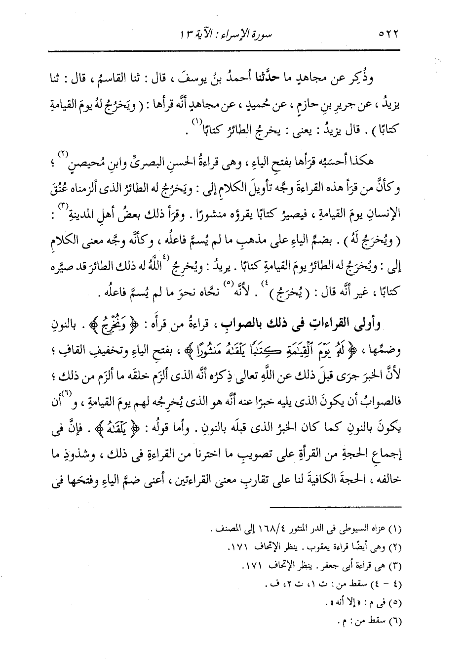 حَدَّثَنَا أَحْمَدُ بْنُ يُوسُفَ، قَالَ: ثنا الْقَاسِمُ، قَالَ: ثنا يَزِيدُ، عَنْ جَرِيرِ بْنِ حَازِمٍ، عَنْ حُمَيْدٍ، عَنْ مُجَاهِدٍ، أَنَّهُ §قَرَأَهَا (وَيُخْرِجُ لَهُ يَوْمَ الْقِيَامَةِ كِتَابًا) قَالَ: يَزِيدُ: يَعْنِي يُخْرِجُ الطَّائِرُ كِتَابًا هَكَذَا أَحْسِبُهُ قَرَأَهَا بِفَتْحِ الْيَاءِ، وَهِيَ قِرَاءَةُ الْحَسَنِ الْبَصْرِيِّ، وَابْنِ مُحَيْصِنٍ , وَكَأَنَّ مَنْ قَرَأَ هَذِهِ الْقِرَاءَةَ وَجَّهَ تَأْوِيلَ الْكَلَامِ إِلَى: وَيَخْرُجُ لَهُ الطَّائِرُ الَّذِي أَلْزَمْنَاهُ عُنُقَ الْإِنْسَانِ يَوْمَ الْقِيَامَةَ فَيَصِيرُ كِتَابًا يَقْرَؤُهُ مَنْشُورًا. وَقَرَأَ ذَلِكَ بَعْضُ أَهْلِ الْمَدِينَةِ: (وَيُخْرَجُ لَهُ) بِضَمِّ الْيَاءِ عَلَى مُذْهِبِ مَا لَمْ يُسَمَّ فَاعِلُهُ، وَكَأَنَّهُ وَجَّهَ مَعْنَى الْكَلَامِ إِلَى: وَيُخْرَجُ لَهُ الطَّائِرُ يَوْمَ الْقِيَامَةِ كِتَابًا، يُرِيدُ: وَيُخْرِجُ اللَّهُ ذَلِكَ الطَّائِرَ قَدْ صَيَّرَهُ كِتَابًا، إِلَّا أَنَّهُ نَحَّاهُ نَحْوَ مَا لَمْ يُسَمَّ فَاعِلَهُ. وَأَوْلَى الْقِرَاءَاتِ فِي ذَلِكَ بِالصَّوَابِ، قِرَاءَةُ مَنْ قَرَأَهُ: {وَنُخْرِجُ} [الإسراء: 13] بِالنُّونِ وَضَمِّهَا {لَهُ يَوْمَ الْقِيَامَةِ كِتَابًا يَلْقَاهُ مَنْشُورًا} [الإسراء: 13] بِفَتْحِ الْيَاءِ وَتَخْفِيفِ الْقَافِ، لِأَنَّ الْخَبَرَ جَرَى قَبْلَ ذَلِكَ عَنِ اللَّهِ تَعَالَى أَنَّهُ الَّذِي أَلْزَمَ خَلْقَهُ مَا أَلْزَمَ مِنْ ذَلِكَ، فَالصَّوَابُ أَنْ يَكُونَ الَّذِي يَلِيهِ خَبَرًا عَنْهُ، أَنَّهُ هُوَ الَّذِي يُخْرِجُهُ لَهُمْ يَوْمَ الْقِيَامَةِ، أَنْ يَكُونَ بِالنُّونِ كَمَا كَانَ الْخَبَرُ الَّذِي قَبْلَهُ بِالنُّونِ. وَأَمَّا قَوْلُهُ: {يَلْقَاهُ} [الإسراء: 13] فَإِنَّ فِي إِجْمَاعِ الْحُجَّةِ مِنَ الْقُرَّاءِ عَلَى تَصْوِيبِ مَا اخْتَرْنَا مِنَ الْقِرَاءَةِ فِي ذَلِكَ، وَشُذُوذِ مَا خَالَفَهُ الْحُجَّةُ الْكَافِيَةُ لَنَا عَلَى تَقَارُبِ مَعْنَى الْقِرَاءَتَيْنِ: أَعِنِّي ضَمَّ الْيَاءِ وَفَتْحِهَا فِي