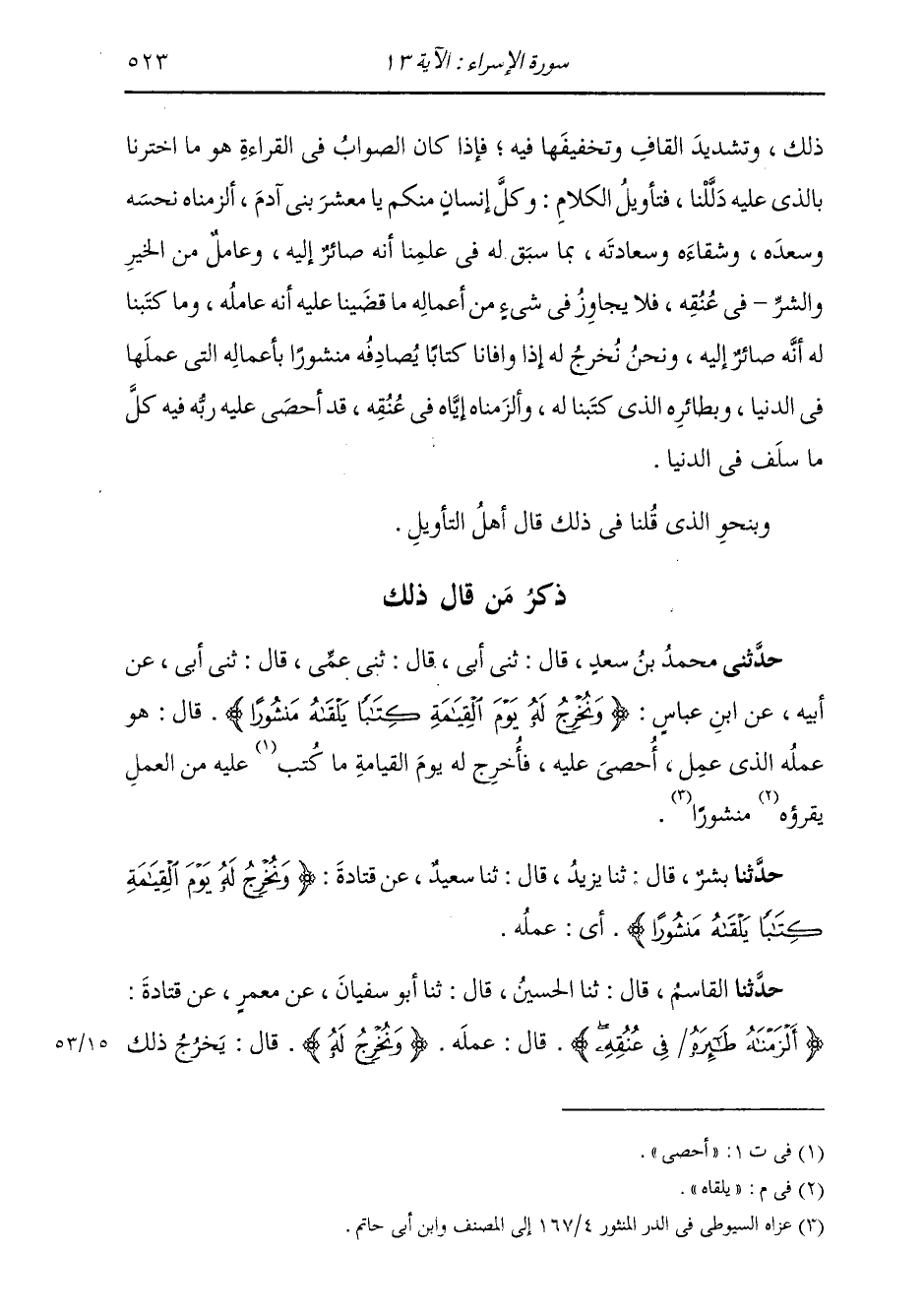 ذَلِكَ، وَتَشْدِيدِ الْقَافِ وَتَخْفِيفِهَا فِيهِ، فَإِذَا كَانَ الصَّوَابُ فِي الْقِرَاءَةِ هُوَ مَا اخْتَرْنَا بِالَّذِي عَلَيْهِ دَلَّلْنَا، فَتَأْوِيلُ الْكَلَامِ: وَكُلَّ إِنْسَانٍ مِنْكُمْ يَا مَعْشَرَ بَنِي آدَمَ، أَلْزَمْنَاهُ نَحْسَهُ وَسَعْدَهُ وَشَقَاءَهُ وَسَعَادَتَهُ، بِمَا سَبَقَ لَهُ فِي عِلْمِنَا أَنَّهُ صَائِرٌ إِلَيْهِ، وَعَامِلٌ مِنَ الْخَيْرِ وَالشَّرِّ فِي عُنُقِهِ، فَلَا يُجَاوِزُ فِي شَيْءٍ مِنْ أَعْمَالِهِ مَا قَضَيْنَا عَلَيْهِ أَنَّهُ عَامِلُهُ، وَمَا كَتَبْنَا لَهُ أَنَّهُ صَائِرٌ إِلَيْهِ، وَنَحْنُ نُخْرِجُ لَهُ إِذَا وَافَانَا كِتَابًا يُصَادِفُهُ مَنْشُورًا بِأَعْمَالِهِ الَّتِي عَمِلَهَا فِي الدُّنْيَا، وَبِطَائِرِهِ الَّذِي كَتَبْنَا لَهُ، وَأَلْزَمْنَاهُ إِيَّاهُ فِي عُنُقِهِ، قَدْ أَحْصَى عَلَيْهِ رَبَّهُ فِيهِ كُلَّ مَا سَلَفَ فِي الدُّنْيَا. وَبِنَحْوِ الَّذِي قُلْنَا فِي ذَلِكَ، قَالَ أَهْلُ التَّأْوِيلِ