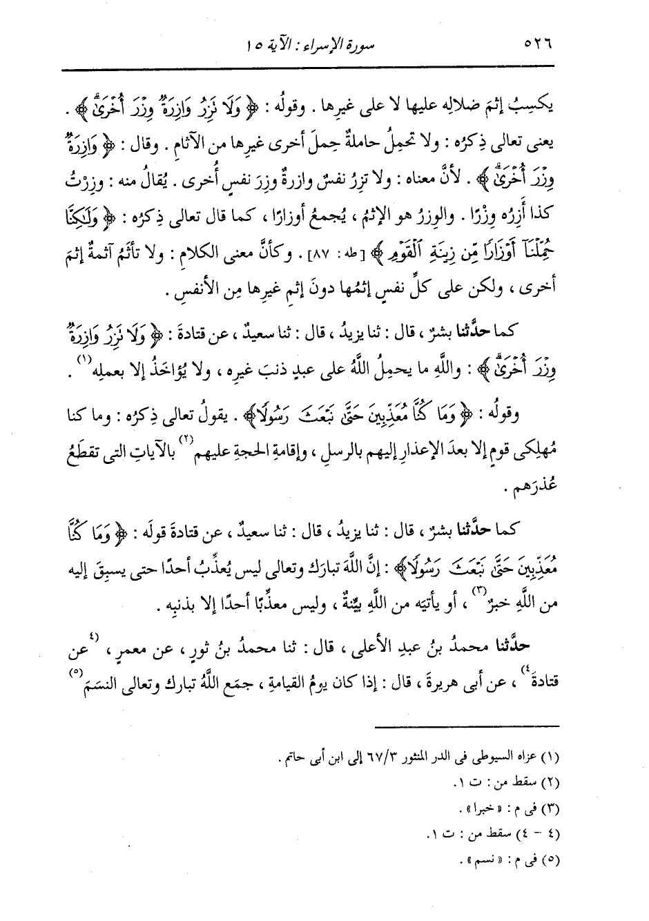 حَدَّثَنَا بِشْرٌ، قَالَ: ثنا يَزِيدُ، قَالَ: ثنا سَعِيدٌ، عَنْ قَتَادَةَ، {§وَلَا تَزِرُ وَازِرَةٌ وِزْرَ أُخْرَى} [الإسراء: 15] وَاللَّهِ مَا يَحْمِلُ اللَّهُ عَلَى عَبْدٍ ذَنْبَ غَيْرِهِ، وَلَا يُؤَاخَذُ إِلَّا بِعَمَلِهِ
