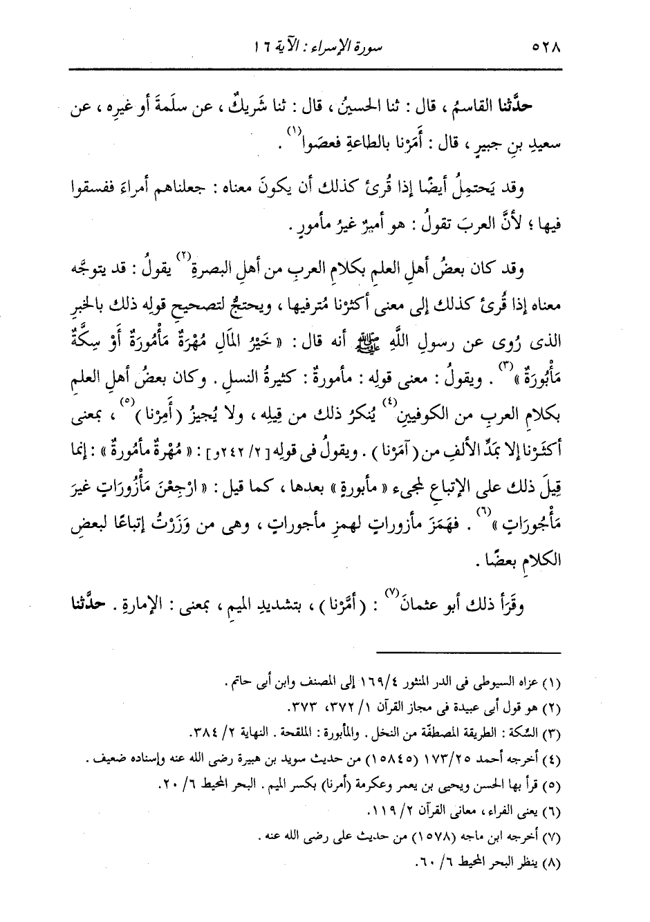 حَدَّثَنَا الْقَاسِمُ، قَالَ: ثنا الْحُسَيْنُ، قَالَ: ثنا شَرِيكٌ، عَنْ سَلَمَةَ، أَوْ غَيْرِهِ، عَنْ سَعِيدِ بْنِ جُبَيْرٍ، قَالَ: §أَمَرْنَا بِالطَّاعَةِ فَعَصَوْا وَقَدْ يَحْتَمِلُ أَيْضًا إِذَا قُرِئَ كَذَلِكَ أَنْ يَكُونَ مَعْنَاهُ: جَعَلْنَاهُمْ أُمَرَاءَ فَفَسَقُوا فِيهَا؛ لِأَنَّ الْعَرَبَ تَقُولُ: هُوَ أَمِيرٌ غَيْرُ مَأْمُورٍ. وَقَدْ كَانَ بَعْضُ أَهْلِ الْعِلْمِ بِكَلَامِ الْعَرَبِ مِنْ أَهْلِ الْبَصْرَةِ يَقُولُ: قَدْ يَتَوَجَّهُ مَعْنَاهُ إِذَا قُرِئَ كَذَلِكَ إِلَى مَعْنَى أَكْثَرْنَا مُتْرَفِيهَا، وَيُحْتَجُّ لِتَصْحِيحِهِ ذَلِكَ بِالْخَبَرِ الَّذِي رُوِيَ عَنْ رَسُولِ اللَّهِ صَلَّى اللهُ عَلَيْهِ وَسَلَّمَ أَنَّهُ قَالَ: «خَيْرُ الْمَالِ مُهْرَةٌ مَأْمُورَةٌ أَوْ سِكَّةٌ مَأْبُورَةٌ» وَيَقُولُ: إِنَّ مَعْنَى قَوْلِهِ: مَأْمُورَةٌ: كَثِيرَةُ النَّسْلِ. وَكَانَ بَعْضُ أَهْلِ الْعِلْمِ بِكَلَامِ الْعَرَبِ مِنَ الْكُوفِيِّينَ يُنْكِرُ ذَلِكَ مِنْ قِيلِهِ، وَلَا يُجِيزُنَا أَمَرْنَا، بِمَعْنَى أَكْثَرْنَا إِلَّا بِمَدِّ الْأَلِفِ مِنْ أَمَرْنَا. وَيَقُولُ فِي قَوْلِهِ «مُهْرَةٌ مَأْمُورَةٌ» : إِنَّمَا قِيلَ ذَلِكَ عَلَى الِاتِّبَاعِ لِمَجِيءِ مَأْبُورَةٌ بَعْدَهَا، كَمَا قِيلَ: «ارْجِعْنَ مَأْزُورَاتٍ غَيْرَ مَأْجُورَاتٍ» فَهَمَزَ مَأْزُورَاتٍ لِهَمْزِ مَأْجُورَاتٍ، وَهِيَ مِنْ وَزَرْتُ إِتْبَاعًا لِبَعْضِ الْكَلَامِ بَعْضًا. وَقَرَأَ ذَلِكَ أَبُو عُثْمَانَ «أَمَّرْنَا» بِتَشْدِيدِ الْمِيمِ، بِمَعْنَى الْإِمَارَةِ