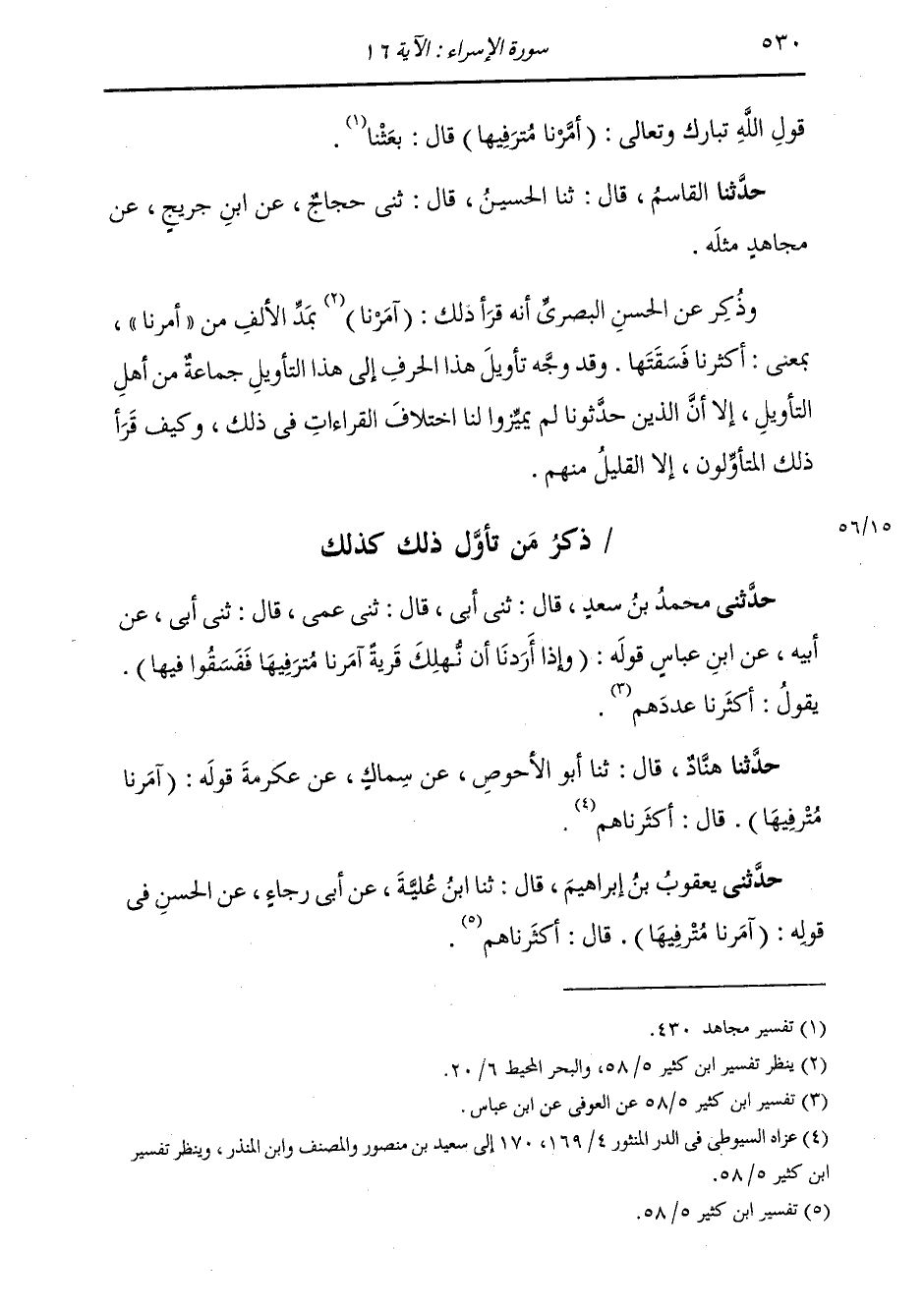 حَدَّثَنِي يَعْقُوبُ بْنُ إِبْرَاهِيمَ، قَالَ: ثنا ابْنُ عُلَيَّةَ، عَنْ أَبِي رَجَاءٍ، عَنِ الْحَسَنِ، §فِي قَوْلِهِ {أَمَرْنَا مُتْرَفِيهَا} [الإسراء: 16] قَالَ: أَكْثَرْنَاهُمْ