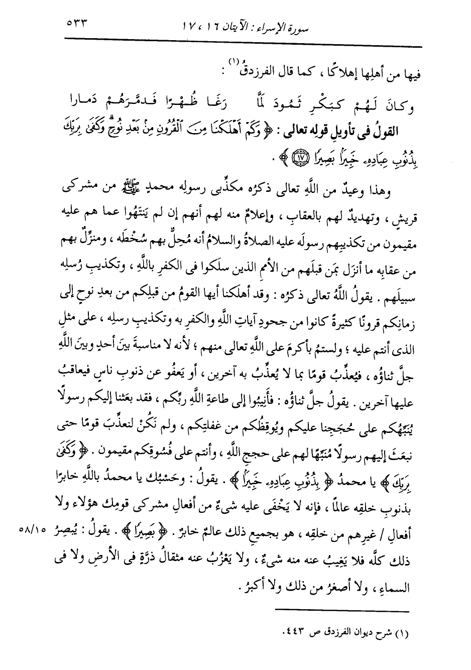 §الْقَوْلُ فِي تَأْوِيلِ قَوْلِهِ تَعَالَى {وَكَمْ أَهْلَكْنَا مِنَ الْقُرُونِ مِنْ بَعْدِ نُوحٍ وَكَفَى بِرَبِّكَ بِذُنُوبِ عِبَادِهِ خَبِيرًا بَصِيرًا} [الإسراء: 17] وَهَذَا وَعِيدٌ مِنَ اللَّهِ تَعَالَى ذِكْرُهُ مُكَذِّبِي رَسُولِهِ مُحَمَّدٍ صَلَّى اللهُ عَلَيْهِ وَسَلَّمَ مِنْ مُشْرِكِي قُرَيْشٍ، وَتَهْدِيدُهُ لَهُمْ بِالْعِقَابِ، وَإِعْلَامٌ مِنْهُ لَهُمْ أَنَّهُمْ إِنْ لَمْ يَنْتَهُوا عَمَّا هُمْ عَلَيْهِ مُقِيمُونَ مِنْ تَكْذِيبِهِمٍ رَسُولَهُ صَلَّى اللهُ عَلَيْهِ وَسَلَّمَ أَنَّهُ مُحِلٌّ بِهِمْ سَخَطَهُ، وَمُنْزِلٌ بِهِمْ مِنْ عِقَابِهِ مَا أَنْزَلَ بِمَنْ قَبْلَهُمْ مِنَ الْأُمَمِ الَّذِينَ سَلَكُوا فِي الْكُفْرِ بِاللَّهِ وَتَكْذِيبِ رُسُلِهِ سَبِيلَهُمْ. يَقُولُ اللَّهُ تَعَالَى ذِكْرُهُ: وَقَدْ أَهْلَكْنَا أَيُّهَا الْقَوْمُ مَنْ قَبْلَكُمْ مِنْ بَعْدِ نُوحٍ إِلَى زَمَانِكُمْ قُرُونًا كَثِيرَةً كَانُوا مِنْ جُحُودِ آيَاتِ اللَّهِ وَالْكُفْرِ بِهِ، وَتَكْذِيبِ رُسُلِهِ، عَلَى مِثْلِ الَّذِي أَنْتُمْ عَلَيْهِ، وَلَسْتُمْ بِأَكْرَمَ عَلَى اللَّهِ تَعَالَى مِنْهُمْ، لِأَنَّهُ لَا مُنَاسَبَةَ بَيْنَ أَحَدٍ وَبَيْنَ اللَّهِ جَلَّ ثَنَاؤُهُ، فَيُعَذِّبُ قَوْمًا بِمَا لَا يُعَذِّبُ بِهِ آخَرِينَ، أَوْ يَعْفُو عَنْ ذُنُوبِ نَاسٍ فَيُعَاقِبُ عَلَيْهَا آخَرِينَ، يَقُولُ جَلَّ ثَنَاؤُهُ: فَأَنِيبُوا إِلَى طَاعَةِ اللَّهِ رَبِّكُمْ، فَقَدْ بَعَثْنَا إِلَيْكُمْ رَسُولًا يُنَبِّهُكُمْ عَلَى حُجَجِنَا عَلَيْكُمْ، وَيُوقِظُكُمْ مِنْ غَفْلَتِكُمْ، وَلَمْ نَكُنْ لِنُعَذِّبَ قَوْمًا حَتَّى نَبْعَثَ إِلَيْهِمْ رَسُولًا مُنَبِّهًا لَهُمْ عَلَى حُجَجِ اللَّهِ وَأَنْتُمْ عَلَى فُسُوقِكُمْ مُقِيمُونَ وَكَفَى بِرَبِّكَ يَا مُحَمَّدُ بِذُنُوبِ عِبَادِهِ خَبِيرًا، يَقُولُ: وَحَسْبُكَ يَا مُحَمَّدُ بِاللَّهِ خَابِرًا بِذُنُوبِ خَلْقِهِ عَالِمًا، فَإِنَّهُ لَا يَخْفَى عَلَيْهِ شَيْءٌ مِنْ أَفْعَالِ مُشْرِكِي قَوْمِكَ هَؤُلَاءِ، وَلَا أَفْعَالِ غَيْرِهِمْ مِنْ خَلْقِهِ هُوَ بِجَمِيعِ ذَلِكَ عَالِمٌ خَابِرٌ بَصِيرٌ، يَقُولُ: يُبْصِرُ ذَلِكَ كُلَّهُ فَلَا يَغِيبُ عَنْهُ مِنْهُ شَيْءٌ، وَلَا يَعْزُبُ عَنْهُ مِثْقَالُ ذَرَّةٍ فِي الْأَرْضِ وَلَا فِي السَّمَاءِ، وَلَا أَصْغَرَ مِنْ ذَلِكَ وَلَا أَكْبَرَ.