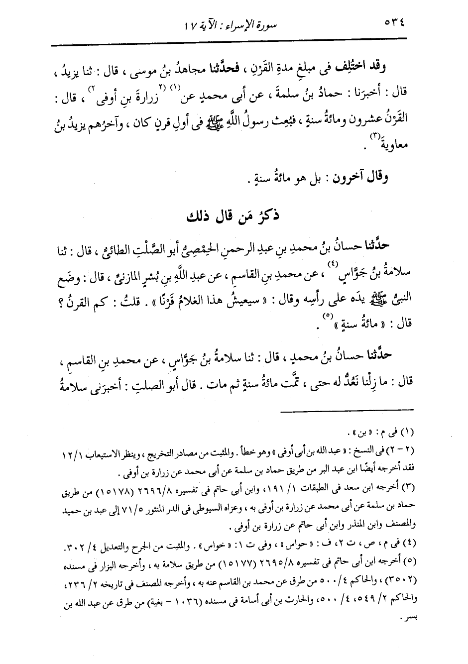 فَحَدَّثَنَا مُجَاهِدُ بْنُ مُوسَى، قَالَ: ثنا يَزِيدُ، قَالَ: ثنا حَمَّادُ بْنُ سَلَمَةَ، عَنْ أَبِي مُحَمَّدِ بْنِ عَبْدِ اللَّهِ بْنِ أَبِي أَوْفَى، قَالَ: §الْقَرْنُ: عِشْرُونَ وَمِائَةُ سَنَةٍ، فَبُعِثَ رَسُولُ اللَّهِ صَلَّى اللهُ عَلَيْهِ وَسَلَّمَ فِي أَوَّلِ قَرْنٍ كَانَ وَآخِرُهُمْ يَزِيدُ بْنُ مُعَاوِيَةَ وَقَالَ آخَرُونَ: بَلْ هُوَ مِائَةُ سَنَةٍ