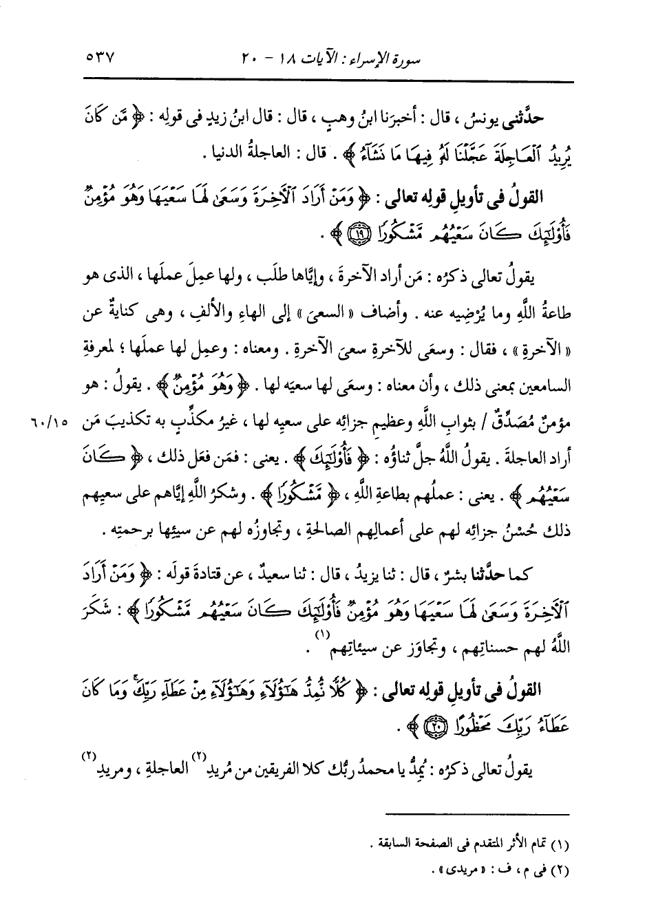§الْقَوْلُ فِي تَأْوِيلِ قَوْلِهِ تَعَالَى: {وَمَنْ أَرَادَ الْآخِرَةَ وَسَعَى لَهَا سَعْيَهَا وَهُوَ مُؤْمِنٌ فَأُولَئِكَ كَانَ سَعْيُهُمْ مَشْكُورًا} [الإسراء: 19] يَقُولُ تَعَالَى ذِكْرُهُ: مَنْ أَرَادَ الْآخِرَةَ وَإِيَّاهَا طَلَبَ، وَلَهَا عَمِلَ عَمِلَهَا الَّذِي هُوَ طَاعَةُ اللَّهِ وَمَا يُرْضِيهِ عَنْهُ، وَأَضَافَ السَّعْيَ إِلَى الْهَاءِ وَالْأَلِفِ وَهِيَ كِنَايَةٌ عَنِ الْآخِرَةِ، فَقَالَ: وَسَعَى لِلْآخِرَةِ سَعْيَ الْآخِرَةِ، وَمَعْنَاهُ: وَعَمِلَ لَهَا عَمَلَهَا لِمَعْرِفَةِ السَّامِعِينَ بِمَعْنَى ذَلِكَ، وَأَنَّ مَعْنَاهُ: وَسَعَى لَهَا سَعْيَهُ لَهَا وَهُوَ مُؤْمِنٌ، يَقُولُ: هُوَ مُؤْمِنٌ مُصَدِّقٌ بِثَوَابِ اللَّهِ، وَعَظِيمِ جَزَائِهِ عَلَى سَعْيِهِ لَهَا، غَيْرُ مُكَذِّبٍ بِهِ تَكْذَيبَ مَنْ أَرَادَ الْعَاجِلَةَ، يَقُولُ اللَّهُ جَلَّ ثَنَاؤُهُ: {فَأُولَئِكَ} [البقرة: 81] يَعْنِي: فَمَنْ فَعَلَ ذَلِكَ {كَانَ سَعْيُهُمْ} [الإسراء: 19] يَعْنِي عَمَلَهُمْ بِطَاعَةِ اللَّهِ {مَشْكُورًا} [الإسراء: 19] وَشُكْرُ اللَّهِ إِيَّاهُمْ عَلَى سَعْيِهِمْ ذَلِكَ حُسْنُ جَزَائِهِ لَهُمْ عَلَى أَعْمَالِهِمُ الصَّالِحَةِ، وَتَجَاوُزُهُ لَهُمْ عَنْ سَيِّئِهَا بِرَحْمَتِهِ. كَمَا: