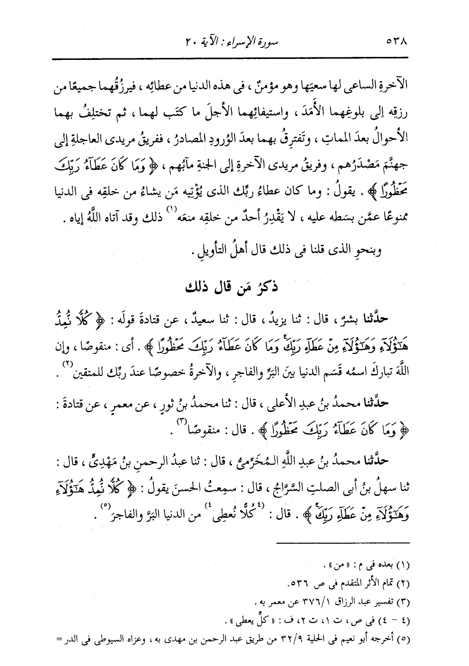 ذِكْرُ مَنْ قَالَ ذَلِكَ: حَدَّثَنَا بِشْرُ بْنُ مُعَاذٍ، قَالَ: ثنا يَزِيدُ، قَالَ: ثنا سَعِيدٌ، عَنْ قَتَادَةَ، §قَوْلُهُ: {كُلًّا نُمِدُّ هَؤُلَاءِ وَهَؤُلَاءِ مِنْ عَطَاءِ رَبِّكَ وَمَا كَانَ عَطَاءُ رَبِّكَ مَحْظُورًا} [الإسراء: 20] أَيْ مَنْقُوصًا، وَإِنَّ اللَّهَ عَزَّ وَجَلَّ قَسَمَ الدُّنْيَا بَيْنَ الْبَرِّ وَالْفَاجِرِ، وَالْآخِرَةُ خُصُوصًا عِنْدَ رَبِّكَ لِلْمُتَّقِينَ