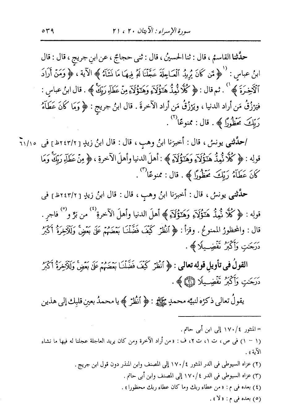 حَدَّثَنِي يُونُسُ، قَالَ: أَخْبَرَنَا ابْنُ وَهْبٍ، قَالَ: قَالَ ابْنُ زَيْدٍ، فِي قَوْلِهِ {§كُلًّا نُمِدُّ هَؤُلَاءِ وَهَؤُلَاءِ} [الإسراء: 20] أَهْلُ الدُّنْيَا وَأَهْلُ الْآخِرَةِ {مِنْ عَطَاءِ رَبِّكَ وَمَا كَانَ عَطَاءُ رَبِّكَ مَحْظُورًا} [الإسراء: 20] مِنْ بَرٍّ وَلَا فَاجِرٍ، قَالَ: وَالْمَحْظُورُ: الْمَمْنُوعُ، وَقَرَأَ {انْظُرْ كَيْفَ فَضَّلْنَا بَعْضَهُمْ عَلَى بَعْضٍ وَلَلْآخِرَةُ أَكْبَرُ دَرَجَاتٍ وَأَكْبَرُ تَفْضِيلًا} [الإسراء: 21]