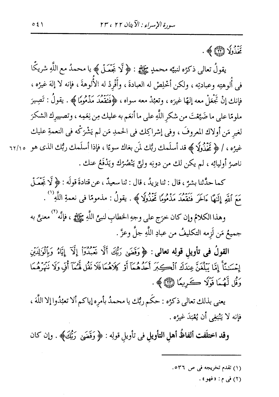 §الْقَوْلُ فِي تَأْوِيلِ قَوْلِهِ تَعَالَى {وَقَضَى رَبُّكَ أَلَّا تَعْبُدُوا إِلَّا إِيَّاهُ وَبِالْوَالِدَينِ إِحْسَانًا إِمَّا يَبْلُغَنَّ عِنْدَكَ الْكِبَرَ أَحَدُهُمَا أَوْ كِلَاهُمَا فَلَا تَقُل لَّهُمَا أُفٍّ وَلَا تَنْهَرْهُمَا وَقُل لَّهُمَا قَوْلًا كَرِيمًا} [الإسراء: 23] يَعْنِي بِذَلِكَ تَعَالَى ذِكْرُهُ حُكْمَ رَبِّكَ يَا مُحَمَّدُ بِأَمْرِهِ إِيَّاكُمْ أَلَّا تَعْبُدُوا إِلَّا اللَّهَ، فَإِنَّهُ لَا يَنْبَغِي أَنْ يُعْبَدَ غَيْرُهُ. وَقَدِ اخْتَلَفَتِ أَلْفَاظُ أَهْلِ التَّأْوِيلِ فِي تَأْوِيلِ قَوْلِهِ {وَقَضَى رَبُّكَ} [الإسراء: 23] وَإِنْ كَانَ -[542]- مَعْنَى جَمِيعِهِمْ فِي ذَلِكَ وَاحِدًا