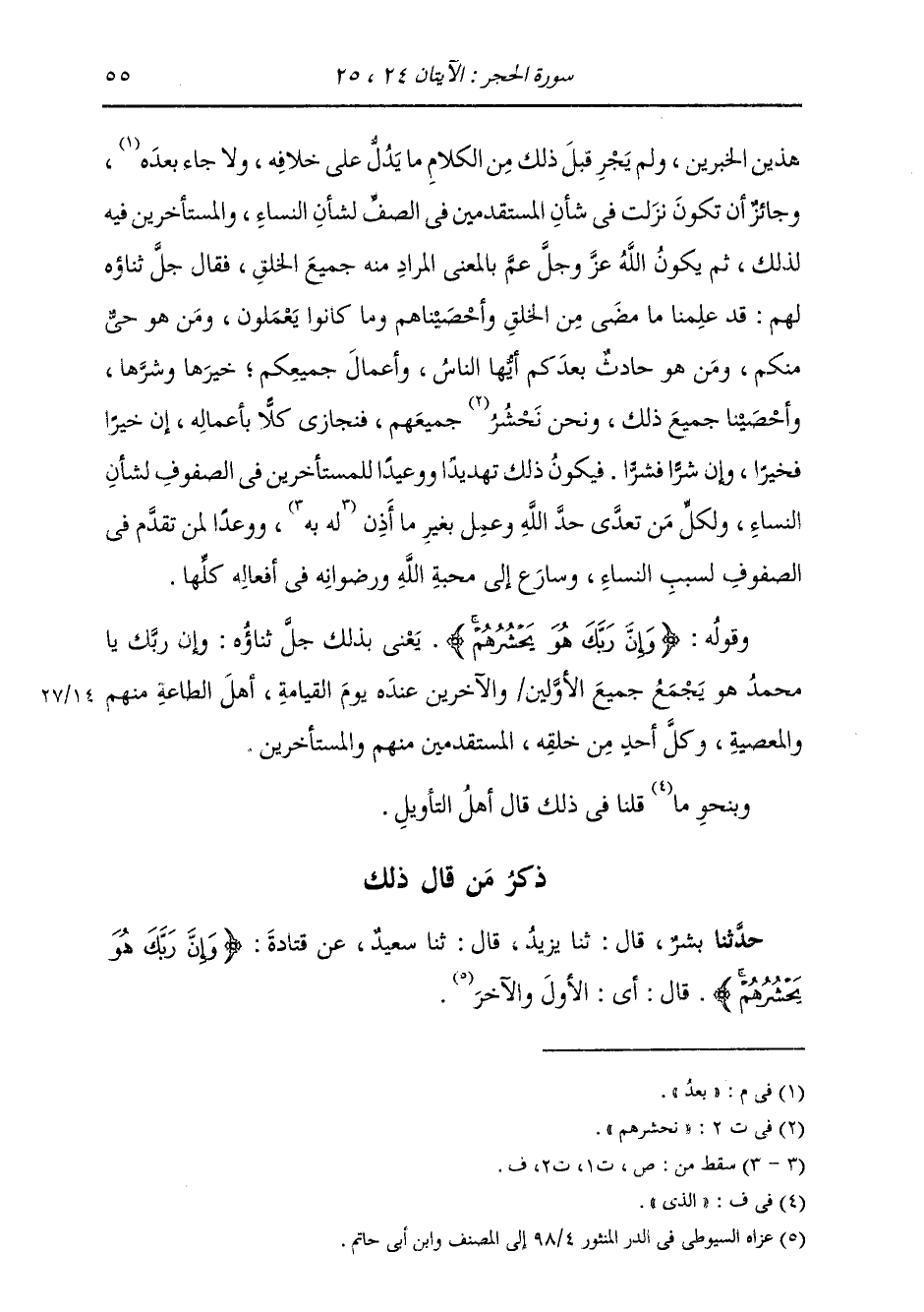 ذِكْرُ مَنْ قَالَ ذَلِكَ: حَدَّثَنَا بِشْرٌ، قَالَ: ثنا يَزِيدُ، قَالَ: ثنا سَعِيدٌ، عَنْ قَتَادَةَ: {§وَإِنَّ رَبَّكَ هُوَ يَحْشُرُهُمْ} [الحجر: 25] قَالَ: «أَيِ الْأَوَّلُ وَالْآخِرُ»