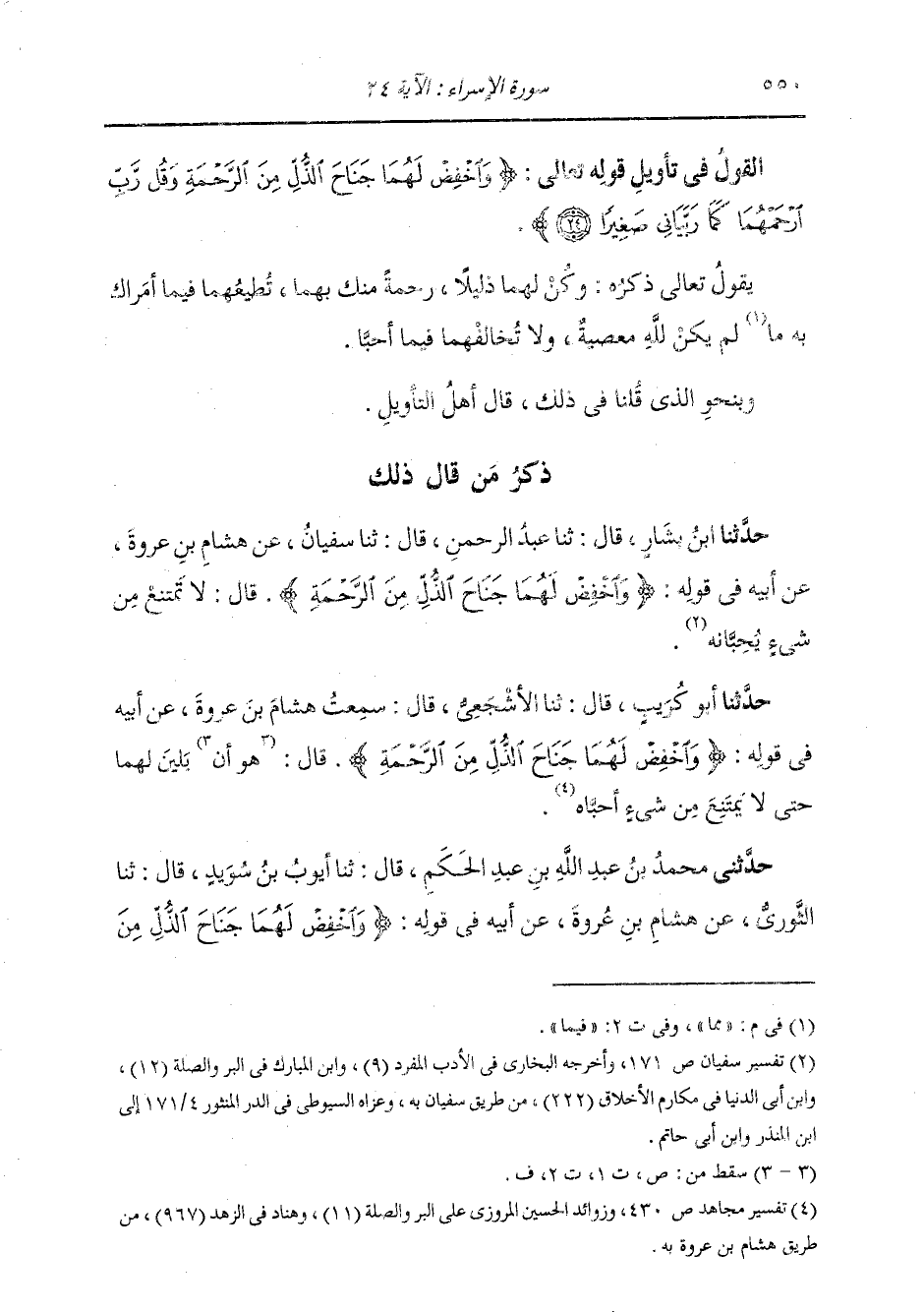 ذِكْرُ مَنْ قَالَ ذَلِكَ: حَدَّثَنَا ابْنُ بَشَّارٍ، قَالَ: ثنا عَبْدُ الرَّحْمَنِ، قَالَ: ثنا سُفْيَانُ، عَنْ هِشَامِ بْنِ عُرْوَةَ، عَنْ أَبِيهِ، فِي قَوْلِهِ {وَاخْفِضْ لَهُمَا جَنَاحَ الذُّلِّ مِنَ الرَّحْمَةِ} [الإسراء: 24] قَالَ: §لَا تَمْتَنِعْ مِنْ شَيْءٍ يُحِبَّانِهِ