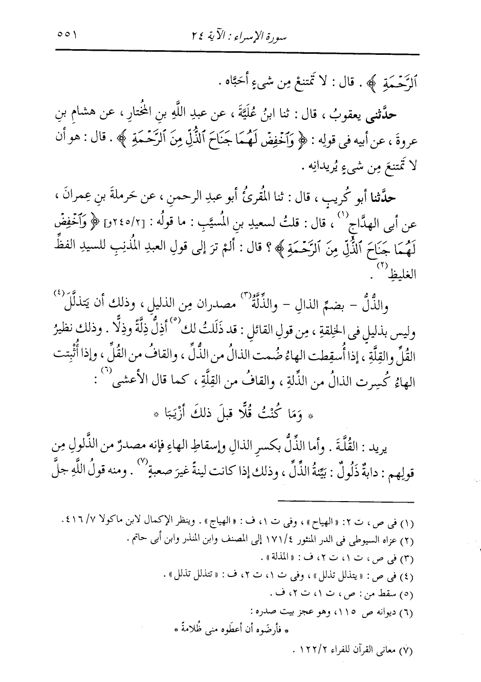 حَدَّثَنَا أَبُو كُرَيْبٍ، قَالَ: ثنا الْمُقْرِئُ أَبُو عَبْدِ الرَّحْمَنِ، عَنْ حَرْمَلَةَ بْنِ عِمْرَانَ، عَنْ أَبِي الْهَدَّاجِ، قَالَ: قُلْتُ لِسَعِيدِ بْنِ الْمُسَيِّبِ: مَا قَوْلُهُ {وَاخْفِضْ لَهُمَا جَنَاحَ الذُّلِّ مِنَ الرَّحْمَةِ} [الإسراء: 24] قَالَ: §أَلَمْ تَرَ إِلَى قَوْلِ الْعَبْدِ الْمُذْنِبِ لِلسَّيِّدِ الْفَظِّ الْغَلِيظِ وَالذُّلُّ بِضَمِّ الذَّالِ وَالذِّلَّةُ مَصْدَرَانِ مِنَ الذَّلِيلِ، وَذَلِكَ أَنْ يَتَذَلَّلَ، وَلَيْسَ بِذَلِيلٍ فِي الْخِلْقَةِ مِنْ قَوْلِ الْقَائِلِ: قَدْ ذَلَلْتُ لَكَ أَذِلُّ ذِلَّةً وَذُلًّا، وَذَلِكَ نَظِيرُ الْقُلِّ وَالْقِلَّةِ، إِذَا أُسْقِطَتِ الْهَاءُ ضُمَّتِ الذَّالُ مِنَ الذُّلِّ، وَالْقَافُ مِنَ الْقُلِّ، وَإِذَا أُثْبِتَتِ الْهَاءُ كُسِرَتِ الذَّالُ مِنَ الذِّلَّةِ، وَالْقَافُ مِنَ الْقِلَّةِ، لِمَا قَالَ الْأَعْشَى: