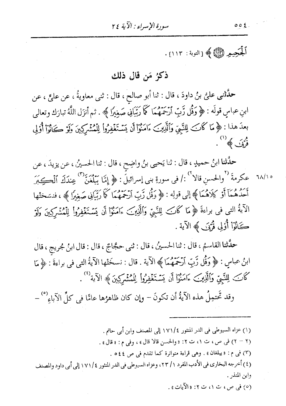 ذِكْرُ مَنْ قَالَ ذَلِكَ: حَدَّثَنِي عَلِيُّ بْنُ دَاوُدَ، قَالَ: ثنا أَبُو صَالِحٍ، قَالَ: ثني مُعَاوِيَةُ، عَنْ عَلِيٍّ، عَنِ ابْنِ عَبَّاسٍ، §قَوْلِهِ: {وَقُلْ رَبِّ ارْحَمْهُمَا كَمَا رَبَّيَانِي صَغِيرًا} [الإسراء: 24] ثُمَّ أَنْزَلَ اللَّهُ عَزَّ وَجَلَّ بَعْدَ هَذَا: {مَا كَانَ لِلنَّبِيِّ وَالَّذِينَ آمَنُوا أَنْ يَسْتَغْفِرُوا لِلْمُشْرِكِينَ وَلَوْ كَانُوا أُولِي قُرْبَى} [التوبة: 113]