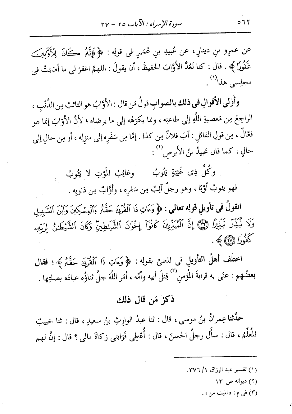 §الْقَوْلُ فِي تَأْوِيلِ قَوْلِهِ تَعَالَى: {وَآتِ ذَا الْقُرْبَى حَقَّهُ وَالْمِسْكِينَ وَابْنَ السَّبِيلِ وَلَا تُبَذِّرْ تَبْذِيرًا إِنَّ الْمُبَذِّرِينَ كَانُوا إِخْوَانَ الشَّيَاطِينَ وَكَانَ الشَّيْطَانُ لِرَبِّهِ كَفُورًا} [الإسراء: 27] اخْتَلَفَ أَهْلُ التَّأْوِيلِ فِي الْمَعْنِيِّ بِقَوْلِهِ {وَآتِ ذَا الْقُرْبَى} [الإسراء: 26] فَقَالَ بَعْضُهُمْ: عَنَى بِهِ: قَرَابَةَ الْمَيِّتِ مِنْ قِبَلِ أَبِيهِ وَأُمِّهِ، أَمَرَ اللَّهُ جَلَّ ثَنَاؤُهُ عِبَادَهُ بِصِلَتِهَا
