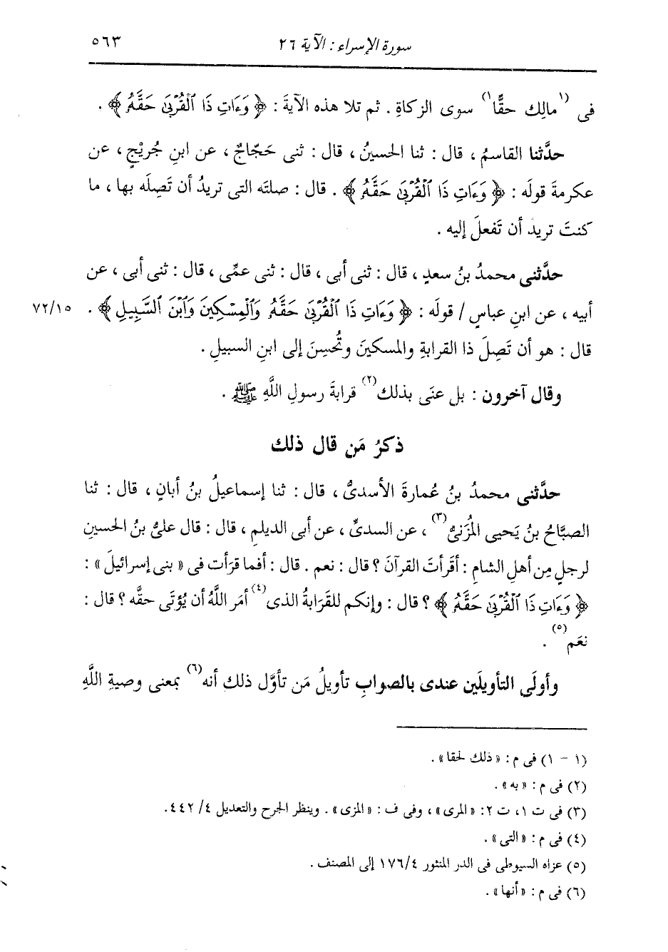 حَدَّثَنِي مُحَمَّدُ بْنُ سَعْدٍ، قَالَ: ثني أَبِي، قَالَ: ثني عَمِّي، قَالَ: ثني أَبِي، عَنْ أَبِيهِ، عَنِ ابْنِ عَبَّاسٍ، §قَوْلُهُ {وَآتِ ذَا الْقُرْبَى حَقَّهُ وَالْمِسْكِينَ وَابْنَ السَّبِيلِ} [الإسراء: 26] قَالَ: هُوَ أَنْ تَصِلَ ذَا الْقُرْبَةِ وَالْمِسْكِينَ وَتُحْسِنَ إِلَى ابْنِ السَّبِيلِ وَقَالَ آخَرُونَ: بَلْ عَنَى بِهِ قَرَابَةَ رَسُولِ اللَّهِ صَلَّى اللهُ عَلَيْهِ وَسَلَّمَ