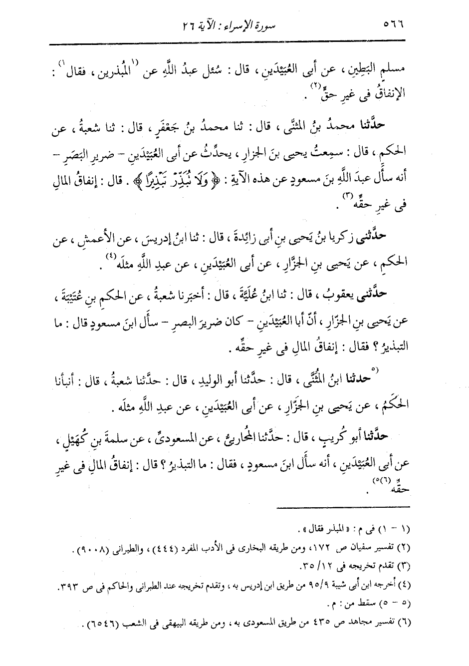 حَدَّثَنَا مُحَمَّدُ بْنُ الْمُثَنَّى، قَالَ: ثنا مُحَمَّدُ بْنُ جَعْفَرٍ، قَالَ: ثنا شُعْبَةُ، عَنِ الْحَكَمِ، قَالَ: سَمِعْتُ يَحْيَى بْنَ الْجَزَّارِ يُحَدِّثُ عَنْ أَبِي الْعُبَيْدَيْنِ ضَرِيرِ الْبَصَرِ، أَنَّهُ سَأَلَ عَبْدَ اللَّهِ بْنَ مَسْعُودٍ عَنْ هَذِهِ الْآيَةِ {وَلَا تُبَذِّرْ تَبْذِيرًا} [الإسراء: 26] قَالَ: §إِنْفَاقُ الْمَالِ فِي غَيْرِ حَقِّهِ حَدَّثَنِي زَكَرِيَّا بْنُ يَحْيَى بْنِ أَبِي زَائِدَةَ، قَالَ: ثنا ابْنُ إِدْرِيسَ، عَنِ الْأَعْمَشِ، عَنِ الْحَكَمِ، عَنْ يَحْيَى بْنِ الْجَزَّارِ، عَنْ أَبِي الْعُبَيْدَيْنِ، عَنْ عَبْدِ اللَّهِ، مِثْلَهُ