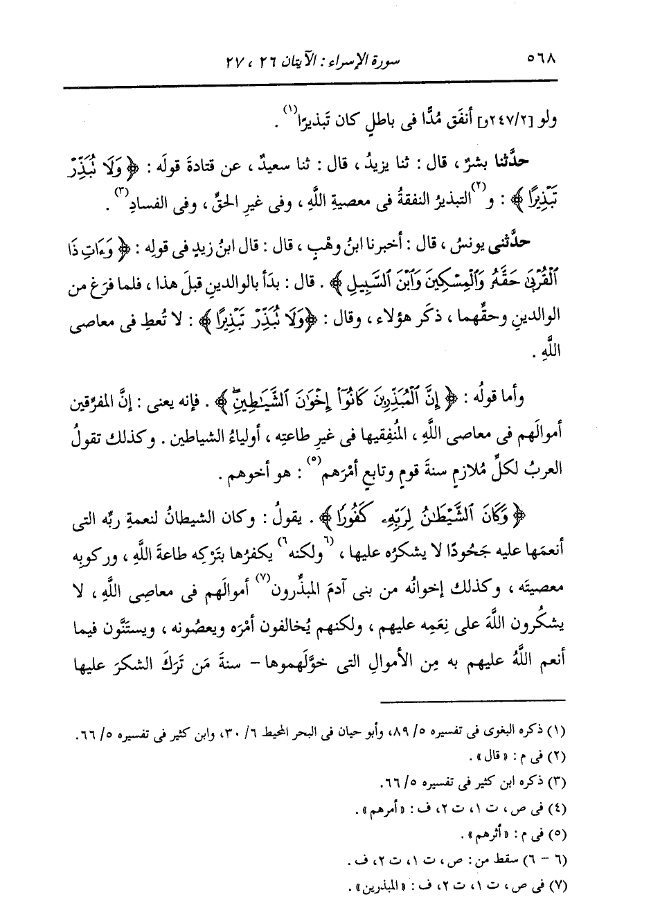 حَدَّثَنَا بِشْرٌ، قَالَ: ثنا يَزِيدُ، قَالَ: ثنا سَعِيدٌ، عَنْ قَتَادَةَ، §قَوْلُهُ {وَلَا تُبَذِّرْ تَبْذِيرًا} [الإسراء: 26] قَالَ: التَّبْذِيرُ: النَّفَقَةُ فِي مَعْصِيَةِ اللَّهِ، وَفِي غَيْرِ الْحَقِّ وَفِي الْفَسَادِ