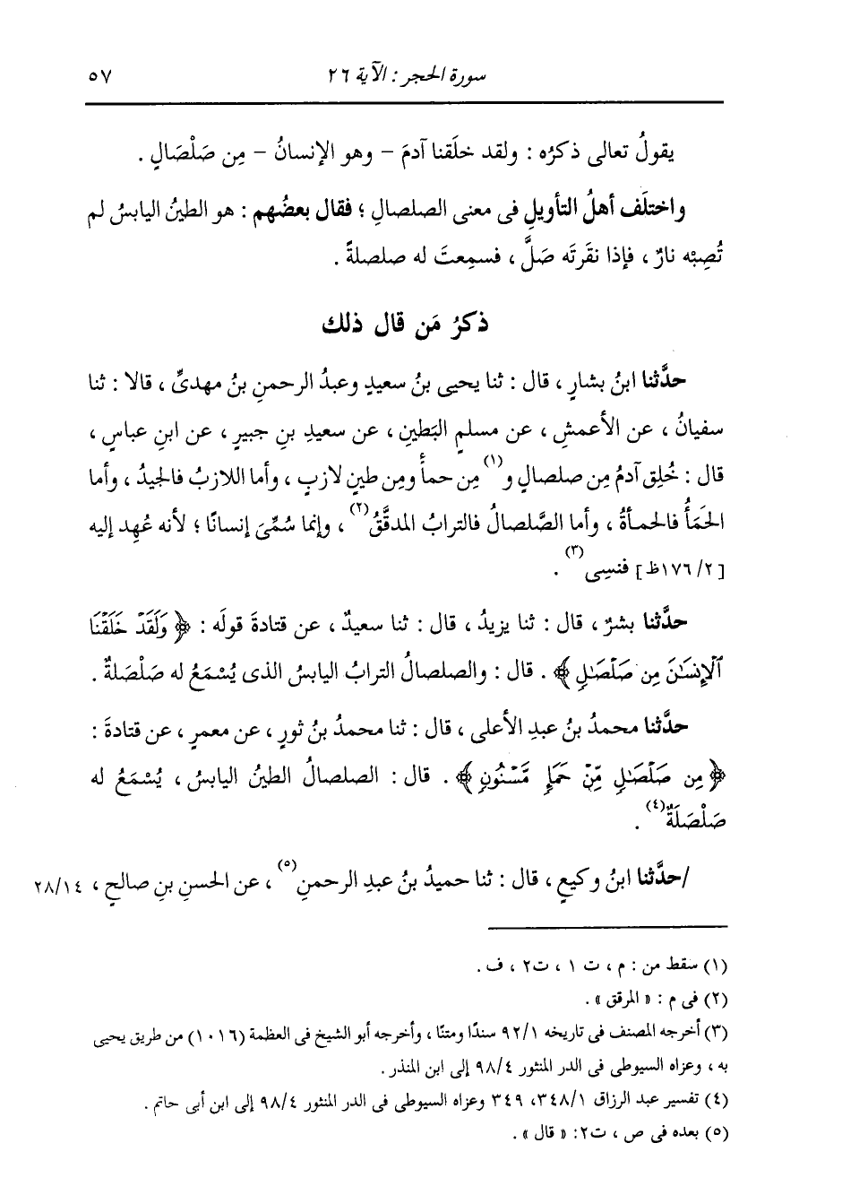 حَدَّثَنَا مُحَمَّدُ بْنُ عَبْدِ الْأَعْلَى قَالَ: ثنا مُحَمَّدُ بْنُ ثَوْرٍ، عَنْ مَعْمَرٍ، عَنْ قَتَادَةَ: {§مِنْ صَلْصَالٍ مِنْ حَمَإِ مَسْنُونٍ} [الحجر: 26] قَالَ: " الصَّلْصَالُ: الطِّينُ الْيَابِسُ يُسْمَعُ لَهُ صَلْصَلَةٌ "