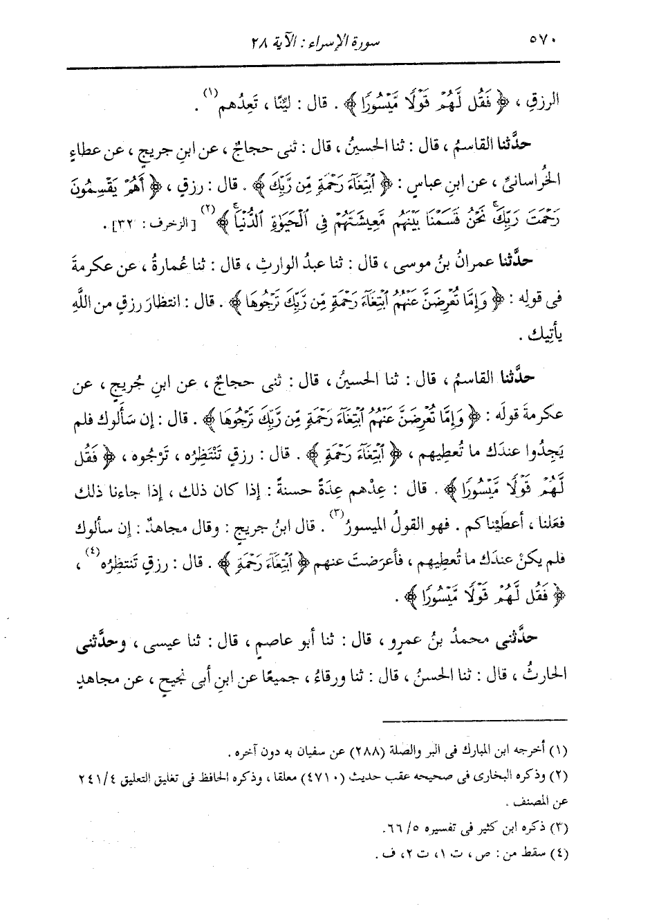 حَدَّثَنَا الْقَاسِمُ، قَالَ: ثنا الْحُسَيْنُ، قَالَ: ثني حَجَّاجٌ، عَنِ ابْنِ جُرَيْجٍ، عَنْ عَطَاءٍ الْخُرَاسَانِيِّ، عَنِ ابْنِ عَبَّاسٍ، {§ابْتِغَاءَ رَحْمَةٍ مِنْ رَبِّكَ} [الإسراء: 28] قَالَ: رِزْقٌ {أَهُمْ يَقْسِمُونَ رَحْمَةَ رَبِّكِ نَحْنُ قَسَمْنَا بَيْنَهُمْ مَعِيشَتَهُمْ} [الزخرف: 32]