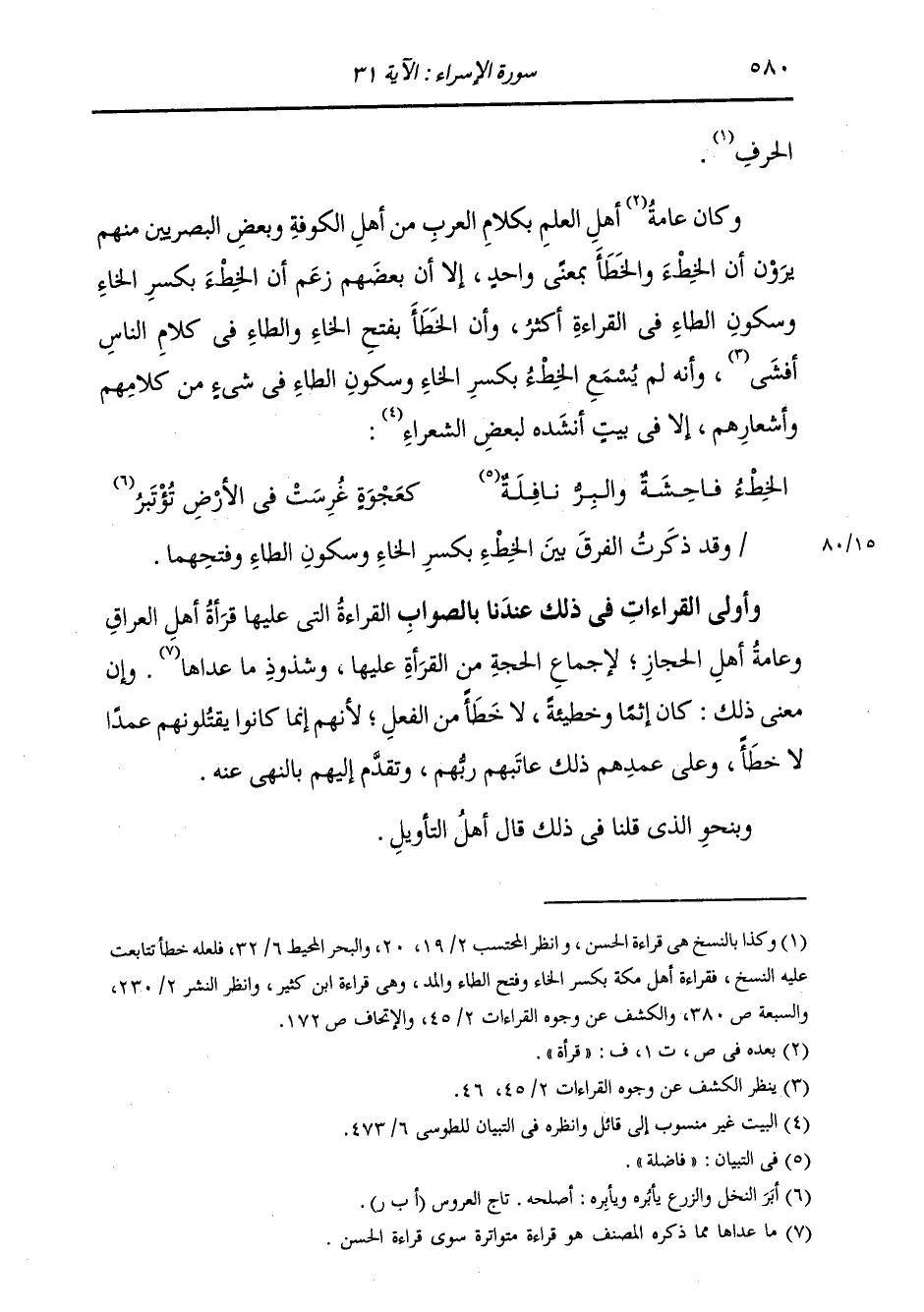 وَقَدْ ذَكَرْتُ الْفَرْقَ بَيْنَ الْخِطْءِ بِكَسْرِ الْخَاءِ وَسُكُونِ الطَّاءِ وَفَتْحِهِمَا. وَأَوْلَى الْقِرَاءَاتِ فِي ذَلِكَ عِنْدَنَا بِالصَّوَابِ، الْقِرَاءَةُ الَّتِي عَلَيْهَا قُرَّاءُ أَهْلِ الْعِرَاقِ، وَعَامَّةُ أَهْلِ الْحِجَازِ، لِإِجْمَاعِ الْحُجَّةِ مِنَ الْقُرَّاءِ عَلَيْهَا، وَشُذُوذِ مَا عَدَاهَا. وَإِنَّ مَعْنَى ذَلِكَ كَانَ إِثْمًا وَخَطِيئَةً، لَا خَطَأً مِنَ الْفِعْلِ، لِأَنَّهُمْ إِنَّمَا كَانُوا يَقْتُلُونَهُمْ عَمْدًا لَا خَطَأً، وَعَلَى عَمْدِهِمْ ذَلِكَ عَاتَبَهُمْ رَبُّهُمْ، وَتَقَدَّمَ إِلَيْهِمْ بِالنَّهْيِ عَنْهُ. وَبِنَحْوِ الَّذِي قُلْنَا فِي ذَلِكَ، قَالَ أَهْلُ التَّأْوِيلِ