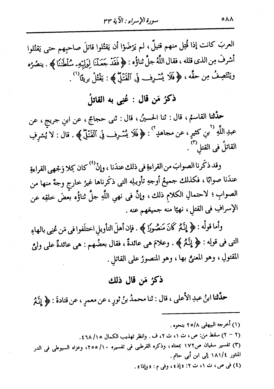 ذِكْرُ مَنْ قَالَ عَنَى بِهِ الْقَاتِلَ: حَدَّثَنَا الْقَاسِمُ، قَالَ: ثنا الْحُسَيْنُ، قَالَ: ثني حَجَّاجٌ، عَنِ ابْنِ جُرَيْجٍ، عَنْ عَبْدِ اللَّهِ بْنِ كَثِيرٍ، عَنْ مُجَاهِدٍ، {§فَلَا يُسْرِفْ فِي الْقَتْلِ} [الإسراء: 33] قَالَ: لَا يُسْرِفِ الْقَاتِلُ فِي الْقَتْلِ وَقَدْ ذَكَرْنَا الصَّوَابَ مِنَ الْقِرَاءَةِ فِي ذَلِكَ عِنْدَنَا، وَإِذَا كَانَ كِلَا وَجْهَيِ الْقِرَاءَةِ عِنْدَنَا صَوَابًا، فَكَذَلِكَ جَمِيعُ أَوْجُهِ تَأْوِيلِهِ الَّتِي ذَكَرْنَاهَا غَيْرُ خَارِجٍ وَجْهٌ مِنْهَا مِنَ الصَّوَابِ، لِاحْتِمَالِ الْكَلَامِ ذَلِكَ، وَإِنَّ فِي نَهْيِ اللَّهِ جَلَّ ثَنَاؤُهُ بَعْضَ خَلْقِهِ عَنِ الْإِسْرَافِ فِي الْقَتْلِ، نَهَى مِنْهُ جَمِيعَهُمْ عَنْهُ