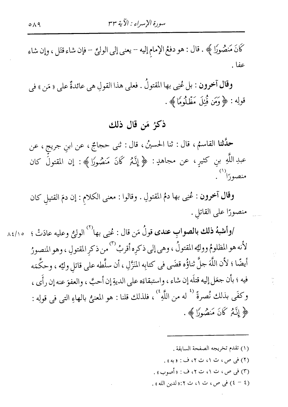 ذِكْرُ مَنْ قَالَ ذَلِكَ: حَدَّثَنَا الْقَاسِمُ، قَالَ: ثنا الْحُسَيْنُ، قَالَ: ثني حَجَّاجٌ، عَنِ ابْنِ جُرَيْجٍ، عَنْ عَبْدِ اللَّهِ بْنِ كَثِيرٍ، عَنْ مُجَاهِدٍ، {§إِنَّهُ كَانَ مَنْصُورًا} [الإسراء: 33] إِنَّ الْمَقْتُولَ كَانَ مَنْصُورًا وَقَالَ آخَرُونَ: عَنَى بِهَا دَمَ الْمَقْتُولِ، وَقَالُوا: مَعْنَى الْكَلَامِ: إِنَّ دَمَ الْقَتِيلِ كَانَ مَنْصُورًا عَلَى الْقَاتِلِ. وَأَشْبَهُ ذَلِكَ بِالصَّوَابِ عِنْدِي قَوْلُ مَنْ قَالَ: عَنَى بِهَا الْوَلِيَّ، وَعَلَيْهِ عَادَتْ، لِأَنَّهُ هُوَ الْمَظْلُومُ، وَوِلِيُّهُ الْمَقْتُولُ، وَهِيَ إِلَى ذِكْرِهِ أَقْرَبُ مِنْ ذِكْرِ الْمَقْتُولِ، وَهُوَ الْمَنْصُورُ أَيْضًا، لِأَنَّ اللَّهَ جَلَّ ثَنَاؤُهُ قَضَى فِي كِتَابِهِ الْمُنَزَلِّ أَنْ سَلَّطَهُ عَلَى قَاتِلِ وَلِيِّهِ وَحَكَّمَهُ فِيهِ بِأَنْ جَعَلَ إِلَيْهِ قَتْلَهُ إِنْ شَاءَ، وَاسْتِبْقَاءَهُ عَلَى الدِّيَةِ إِنْ أَحَبَّ، وَالْعَفْوُ عَنْهُ إِنْ رَأَى، وَكَفَى بِذَلِكَ نُصْرَةً لَهُ مِنَ اللَّهِ جَلَّ ثَنَاؤُهُ، فَلِذَلِكَ قُلْنَا: هُوَ الْمَعْنِيُّ بِالْهَاءِ الَّتِي فِي قَوْلِهِ: {إِنَّهُ كَانَ مَنْصُورًا} [الإسراء: 33]