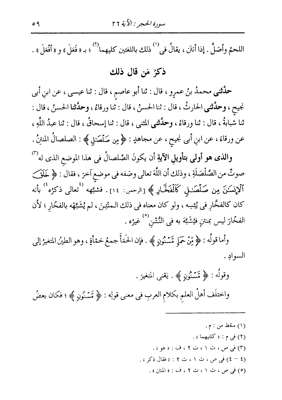ذِكْرُ مَنْ قَالَ ذَلِكَ: حَدَّثَنِي مُحَمَّدُ بْنُ عَمْرٍو، قَالَ: ثنا أَبُو عَاصِمٍ، قَالَ: ثنا عِيسَى، عَنِ ابْنِ أَبِي نَجِيحٍ، وَحَدَّثَنِي الْحَارِثُ، قَالَ: ثنا الْحَسَنُ، قَالَ: ثنا وَرْقَاءُ، وَحَدَّثَنَا الْحَسَنُ، قَالَ: ثنا شَبَابَةُ، قَالَ: ثنا وَرْقَاءُ، وَحَدَّثَنِي الْمُثَنَّى، قَالَ: ثنا إِسْحَاقُ، قَالَ: ثنا عَبْدُ اللَّهِ، عَنْ وَرْقَاءَ، عَنِ ابْنِ أَبِي نَجِيحٍ، عَنْ مُجَاهِدٍ: {§مِنْ صَلْصَالٍ} [الحجر: 26] " الصَّلْصَالُ: الْمُنْتِنُ " وَالَّذِي هُوَ أَوْلَى بِتَأْوِيلِ الْآيَةِ أَنْ يَكُونَ الصَّلْصَالُ فِي هَذَا الْمَوْضِعِ الَّذِي لَهُ صَوْتٌ مِنَ الصَّلْصَلَةِ، وَذَلِكَ أَنَّ اللَّهَ تَعَالَى وَصَفَهُ فِي مَوْضِعٍ آخَرَ فَقَالَ: {خَلَقَ الْإِنْسَانَ مِنْ صَلْصَالٍ كَالْفَخَّارِ} [الرحمن: 14] ، فَشَبَّهَهُ تَعَالَى ذِكْرُهُ بِأَنَّهُ كَانَ كَالْفَخَّارِ فِي يُبْسِهِ، وَلَوْ كَانَ مَعْنَاهُ فِي ذَلِكَ الْمُنْتِنَ لَمْ يُشَبِّهُهُ بِالْفَخَّارِ، لِأَنَّ الْفَخَّارَ لَيْسَ بِمُنْتِنٍ، فَيُشَبَّهُ بِهِ فِي النَّتَنِ غَيْرُهُ