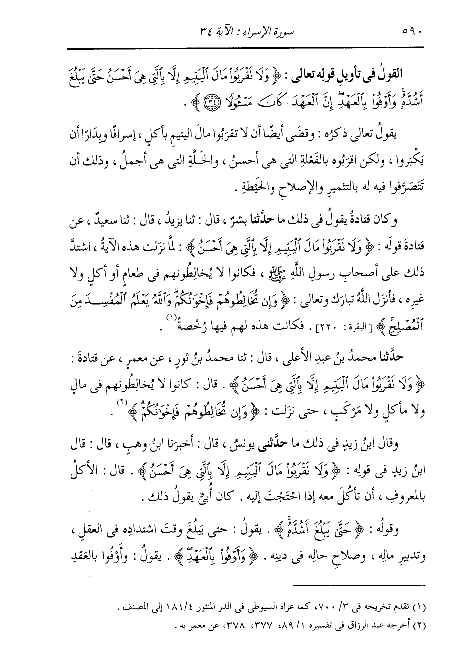 §الْقَوْلُ فِي تَأْوِيلِ قَوْلِهِ تَعَالَى: {وَلَا تَقْرَبُوا مَالَ الْيَتِيمِ إِلَّا بِالَّتِي هِيَ أَحْسَنُ حَتَّى يَبْلُغَ أَشُدَّهُ وَأَوْفُوا بِالْعَهْدِ إِنَّ الْعَهْدَ كَانَ مَسْئُولََا} يَقُولُ تَعَالَى ذِكْرُهُ: وَقَضَى أَيْضًا أَنْ لَا تَقْرَبُوا مَالَ الْيَتِيمِ بِأَكْلٍ إِسْرَافًا وَبِدَارًا أَنْ يَكْبَرُوا، وَلَكِنِ اقْرَبُوهُ بِالْفَعْلَةِ الَّتِي هِيَ أَحْسَنُ، وَالْخَلَّةِ الَّتِي هِيَ أَجْمَلُ، وَذَلِكَ أَنْ تَتَصَرَّفُوا فِيهِ لَهُ بِالتَّثْمِيرِ وَالْإِصْلَاحِ وَالْحَيْطَةِ. وَكَانَ قَتَادَةُ يَقُولُ فِي ذَلِكَ مَا: