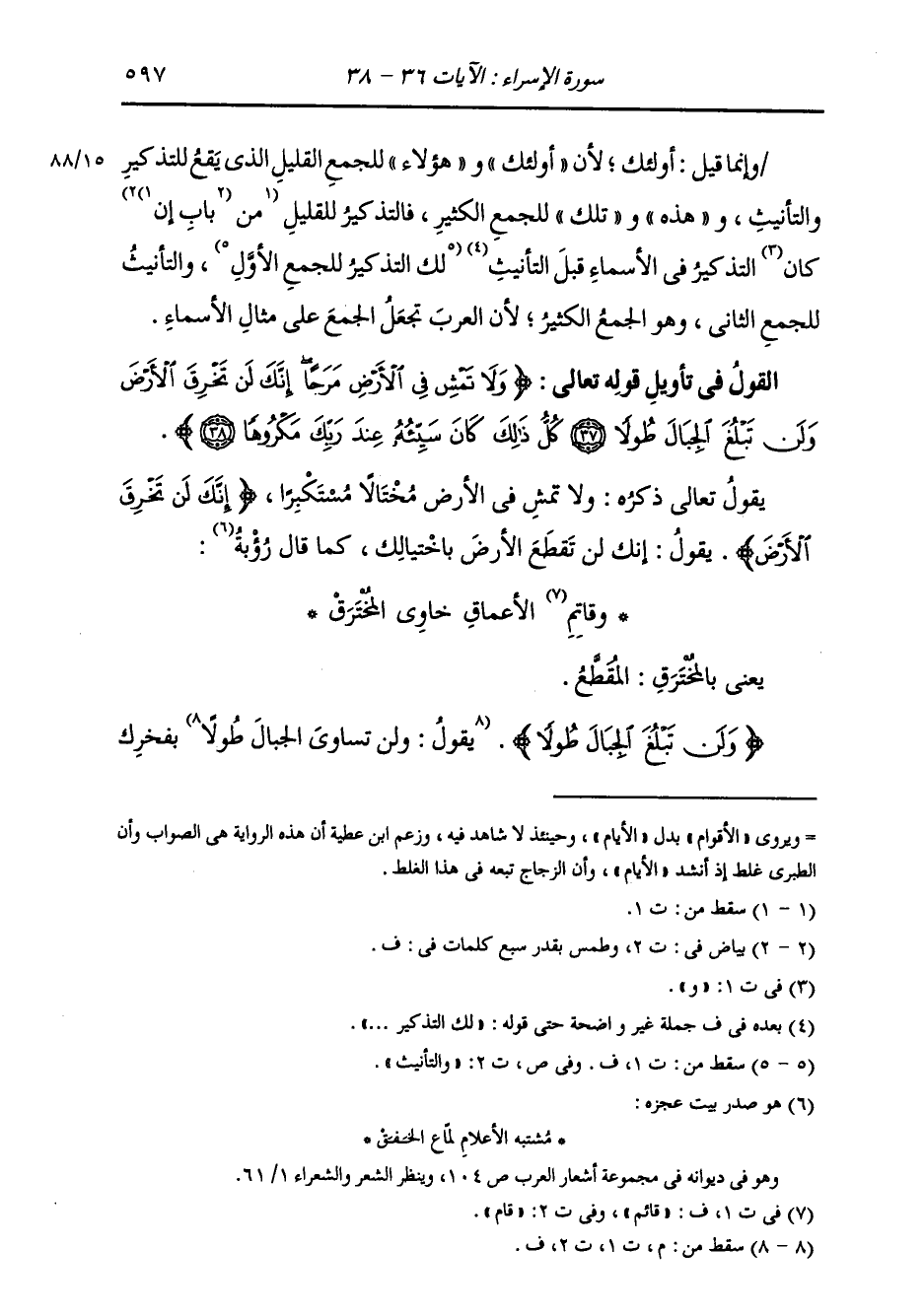 §الْقَوْلُ فِي تَأْوِيلِ قَوْلِهِ تَعَالَى: {وَلَا تَمْشِ فِي الْأَرْضِ مَرَحًا إِنَّكَ لَنْ تَخْرِقَ الْأَرْضَ وَلَنْ تَبْلُغَ الْجِبَالَ طُولًا} [الإسراء: 37] يَقُولُ تَعَالَى ذِكْرُهُ: وَلَا تَمْشِ فِي الْأَرْضِ مُخْتَالًا مُسْتَكْبِرًا {إِنَّكَ لَنْ تَخْرِقَ الْأَرْضَ} [الإسراء: 37] يَقُولُ: إِنَّكَ لَنْ تَقْطَعَ الْأَرْضَ بِاخْتِيَالِكَ، كَمَا قَالَ رُؤْبَةُ: