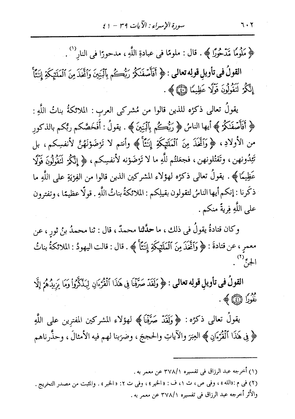 §الْقَوْلُ فِي تَأْوِيلِ قَوْلِهِ تَعَالَى: {أَفَأَصْفَاكُمْ رَبُّكُمْ بِالْبَنِينَ وَاتَّخَذَ مِنَ الْمَلَائِكَةِ إِنَاثًا إِنَّكُمْ لَتَقُولُونَ قَوْلًا عَظِيمًا} [الإسراء: 40] يَقُولُ تَعَالَى ذِكْرُهُ لِلَّذِينَ قَالُوا مِنْ مُشْرِكِي الْعَرَبِ: الْمَلَائِكَةُ بَنَاتُ اللَّهِ {أَفَأَصْفَاكُمْ} [الإسراء: 40] أَيُّهَا النَّاسُ {رَبُّكُمْ بِالْبَنِينَ} [الإسراء: 40] يَقُولُ: أَفَخَصَّكُمْ رَبُّكُمْ بِالذُّكُورِ مِنَ الْأَوْلَادِ {وَاتَّخَذَ مِنَ الْمَلَائِكَةِ إِنَاثًا} [الإسراء: 40] وَأَنْتُمْ لَا تَرْضَوْنَهُنَّ لِأَنْفُسِكُمْ، بَلْ تَئِدُونَهُنَّ، وَتَقْتُلُونَهُنَّ، فَجَعَلْتُمْ لِلَّهِ مَا لَا تَرْضَوْنَهُ لِأَنْفُسِكُمْ {إِنَّكُمْ لَتَقُولُونَ قَوْلًا عَظِيمًا} [الإسراء: 40] يَقُولُ تَعَالَى ذِكْرُهُ لِهَؤُلَاءِ الْمُشْرِكِينَ الَّذِينَ قَالُوا مِنَ الْفِرْيَةِ عَلَى اللَّهِ مَا ذَكَرْنَا: إِنَّكُمْ أَيُّهَا النَّاسُ لَتَقُولُونَ بِقِيلِكُمْ: الْمَلَائِكَةُ بَنَاتُ اللَّهِ، قَوْلًا عَظِيمًا، وَتَفْتَرُونَ عَلَى اللَّهِ فِرْيَةً مِنْكُمْ، وَكَانَ قَتَادَةُ يَقُولُ فِي ذَلِكَ مَا: