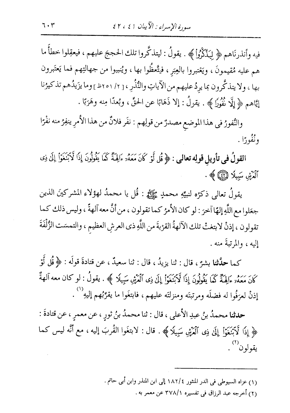 حَدَّثَنَا مُحَمَّدُ بْنُ عَبْدِ الْأَعْلَى، قَالَ ثنا مُحَمَّدُ بْنُ ثَوْرٍ، عَنْ مَعْمَرٍ، عَنْ قَتَادَةَ {§إِذًا لَابْتَغَوْا إِلَى ذِي الْعَرْشِ سَبِيلًا} [الإسراء: 42] قَالَ: لَابْتَغَوُا الْقُرْبَ إِلَيْهِ، مَعَ أَنَّهُ لَيْسَ كَمَا يَقُولُونَ