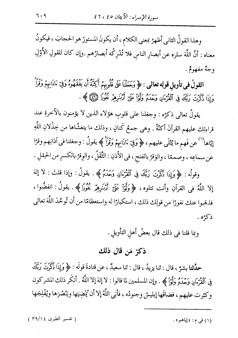 §الْقَوْلُ فِي تَأْوِيلِ قَوْلِهِ تَعَالَى: {وَجَعَلْنَا عَلَى قُلُوبِهِمْ أَكِنَّةً أَنْ يَفْقَهُوهُ وَفِي آذَانِهِمْ وَقْرًا وَإِذَا ذَكَرْتَ رَبَّكَ فِي الْقُرْآنِ وَحْدَهُ وَلَّوْا عَلَى أَدْبَارِهِمْ نُفُورًا} [الإسراء: 46] يَقُولُ تَعَالَى ذِكْرُهُ: وَجَعَلْنَا عَلَى قُلُوبِ هَؤُلَاءِ الَّذِينَ لَا يُؤْمِنُونَ بِالْآخِرَةِ عِنْدَ قِرَاءَتِكَ عَلَيْهِمُ الْقُرْآنَ أَكِنَّةً، وَهِيَ جَمْعُ كِنَانٍ، وَذَلِكَ مَا يَتَغَشَّاهَا مِنْ خِذْلَانِ اللَّهِ إِيَّاهُمْ عَنْ فَهْمِ مَا يُتْلَى عَلَيْهِمْ {وَفِي آذَانِهِمْ وَقْرًا} [الأنعام: 25] يَقُولُ: وَجَعَلْنَا فِي آذَانِهِمْ وَقْرًا عَنْ سَمَاعِهِ، وَصَمَمًا. وَالْوَقْرُ بِالْفَتْحِ فِي الْأُذُنِ: الثِّقَلُ. وَالْوَقْرُ بِالْكَسْرِ: الْحَمْلُ. وَقَوْلُهُ: {وَإِذَا ذَكَرْتَ رَبَّكَ فِي الْقُرْآنِ وَحْدَهُ} [الإسراء: 46] يَقُولُ: وَإِذَا قُلْتُ: لَا إِلَهَ إِلَّا اللَّهُ فِي الْقُرْآنِ وَأَنْتَ تَتْلُوهُ {وَلَّوْا عَلَى أَدْبَارِهِمْ نُفُورًا} [الإسراء: 46] يَقُولُ: انْفَضُّوا، فَذَهَبُوا عَنْكَ نُفُورًا مِنْ قَوْلِكَ اسْتِكْبَارًا لَهُ وَاسْتِعْظَامًا مِنْ أَنْ يُوَحَّدَ اللَّهُ تَعَالَى. وَبِمَا قُلْنَا فِي ذَلِكَ، قَالَ بَعْضُ أَهْلِ التَّأْوِيلِ