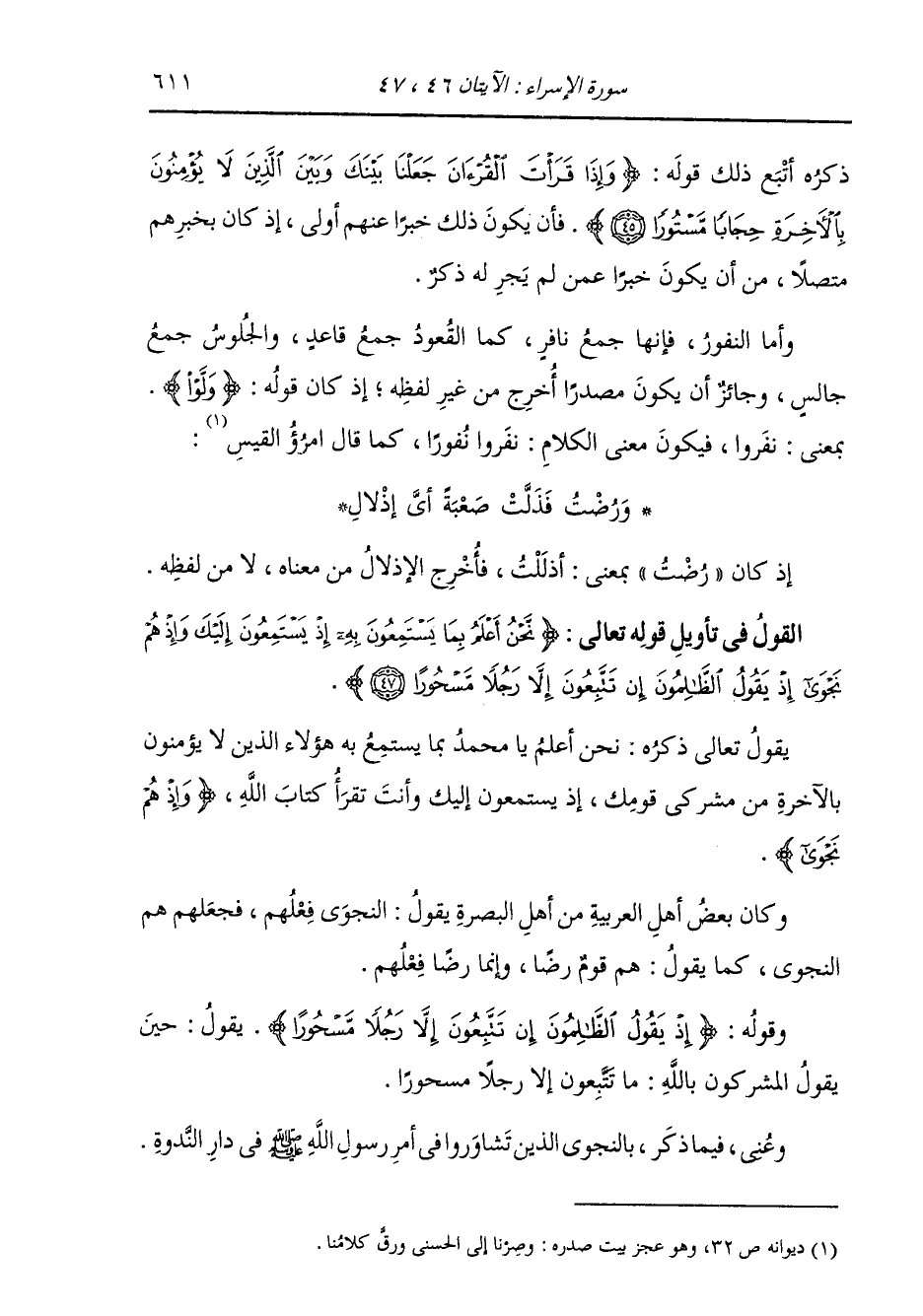 §الْقَوْلُ فِي تَأْوِيلِ قَوْلِهِ تَعَالَى: {نَحْنُ أَعْلَمُ بِمَا يَسْتَمِعُونَ بِهِ إِذْ يَسْتَمِعُونَ إِلَيْكَ وَإِذْ هُمْ نَجْوَى إِذْ يَقُولُ الظَّالِمُونَ إِنْ تَتَّبِعُونَ إِلَّا رَجُلًا مَسْحُورًا} [الإسراء: 47] يَقُولُ تَعَالَى ذِكْرُهُ: نَحْنُ أَعْلَمُ يَا مُحَمَّدُ بِمَا يَسْتَمِعُ بِهِ هَؤُلَاءِ الَّذِينَ لَا يُؤْمِنُونَ بِالْآخِرَةِ مِنْ مُشْرِكِي قَوْمِكَ، إِذْ يَسْتَمِعُونَ إِلَيْكَ وَأَنْتَ تَقْرَأُ كِتَابَ اللَّهِ {وَإِذْ هُمْ نَجْوَى} [الإسراء: 47] وَكَانَ بَعْضُ أَهْلِ الْعَرَبِيَّةِ مِنْ أَهْلِ الْبَصْرَةِ يَقُولُ: النَّجْوَى: فِعْلُهُمْ، فَجَعَلَهُمْ هُمُ النَّجْوَى، كَمَا يَقُولُ: هُمْ قَوْمٌ رِضًا، وَإِنَّمَا رِضًا: فِعْلُهُمْ