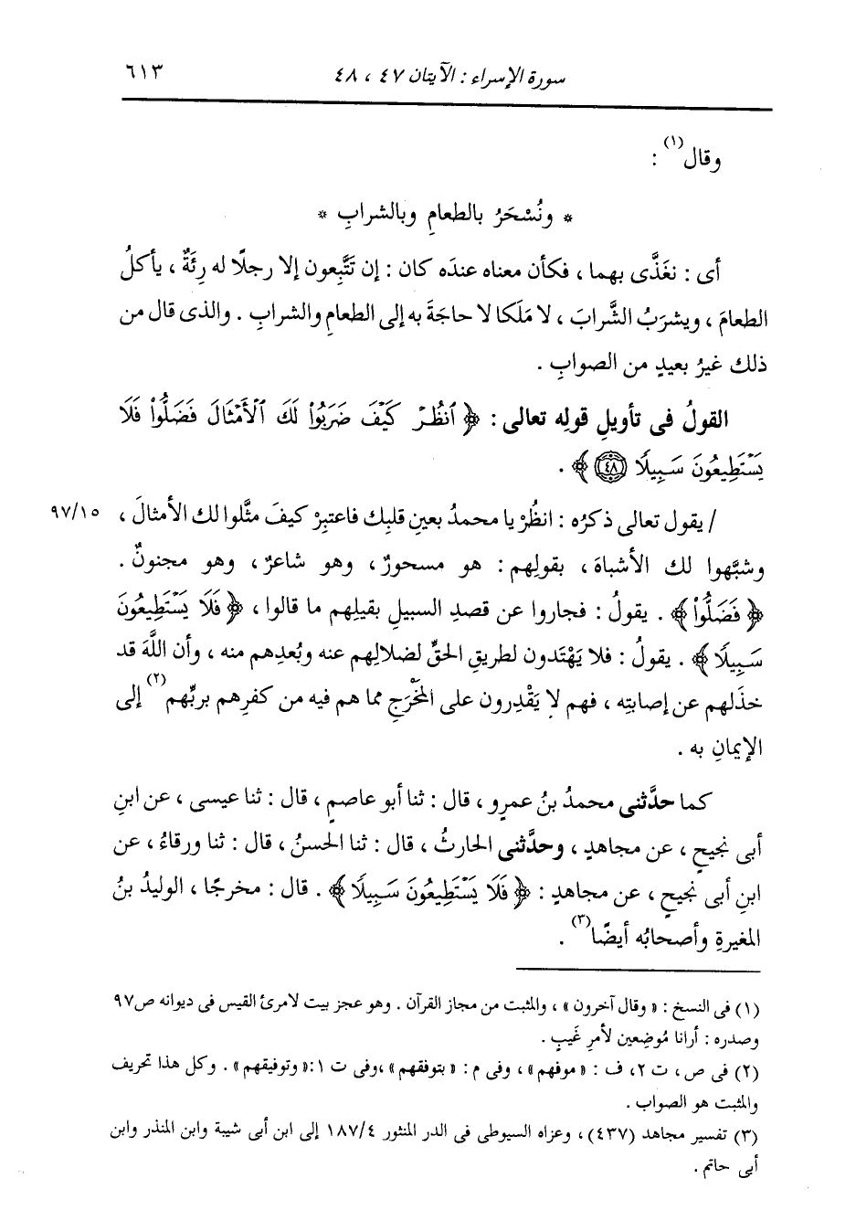 حَدَّثَنِي مُحَمَّدُ بْنُ عَمْرٍو، قَالَ: ثنا أَبُو عَاصِمٍ، قَالَ: ثنا عِيسَى، عَنِ ابْنِ أَبِي نَجِيحٍ، عَنْ مُجَاهِدٍ، وَحَدَّثَنِي الْحَارِثُ، قَالَ: ثنا الْحَسَنُ، قَالَ: ثنا وَرْقَاءُ، عَنِ ابْنِ أَبِي نَجِيحٍ، عَنْ مُجَاهِدٍ، {§فَلَا يَسْتَطِيعُونَ سَبِيلًا} [الإسراء: 48] قَالَ: مَخْرَجًا، الْوَلِيدُ بْنُ الْمُغِيرَةِ وَأَصْحَابُهُ أَيْضًا
