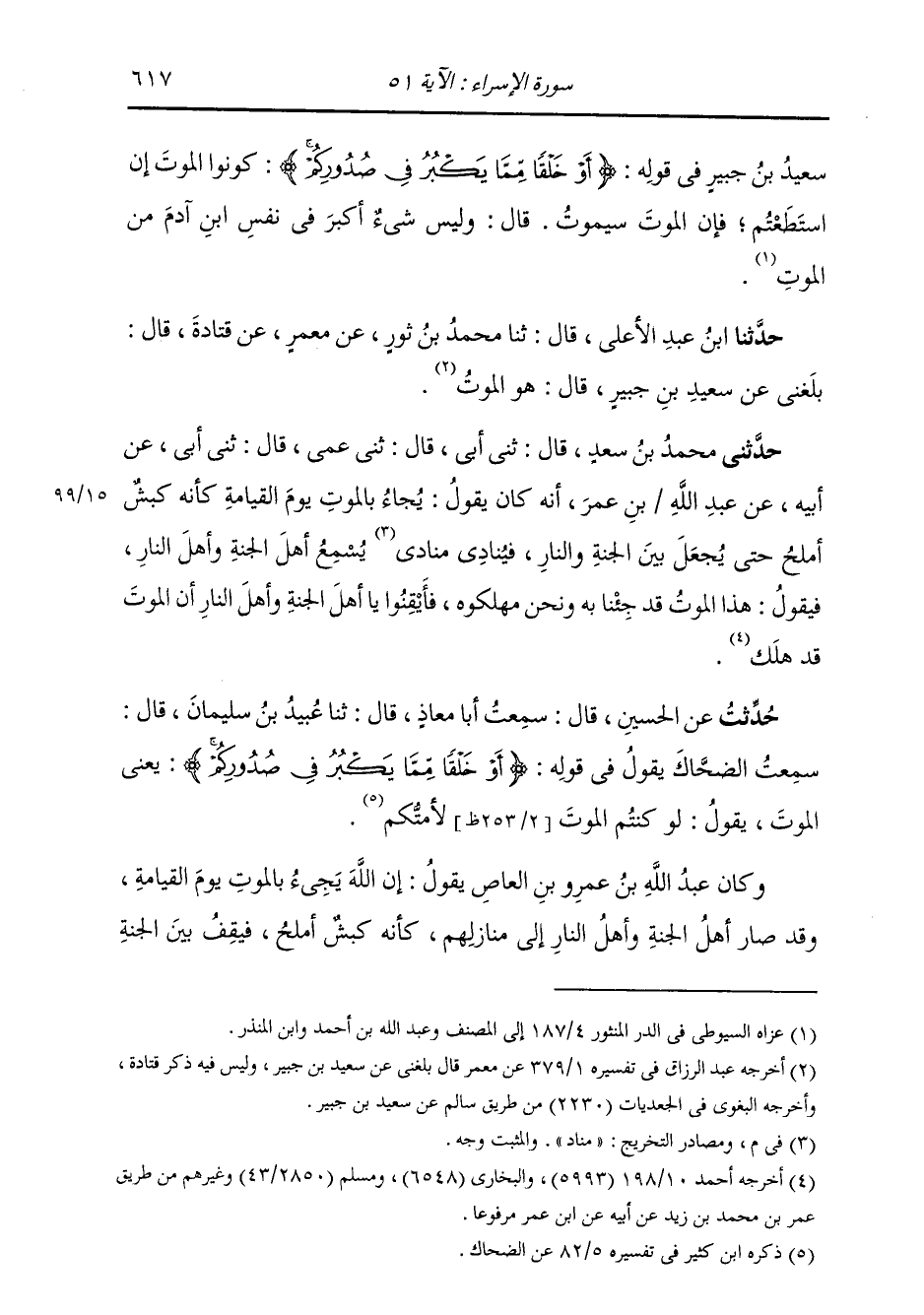 حُدِّثْتُ عَنِ الْحُسَيْنِ، قَالَ: سَمِعْتُ أَبَا مُعَاذٍ، قَالَ: ثنا عُبَيْدُ بْنُ سُلَيْمَانَ، قَالَ: سَمِعْتُ الضَّحَّاكَ، يَقُولُ فِي قَوْلِهِ: {§أَوْ خَلْقًا مِمَّا يَكْبُرُ فِي صُدُورِكُمْ} [الإسراء: 51] يَعْنِي الْمَوْتَ، يَقُولُ: لَوْ كُنْتُمُ الْمَوْتَ لَأَمَتُّكُمْ وَكَانَ عَبْدُ اللَّهِ بْنُ عَمْرِو بْنِ الْعَاصِ يَقُولُ: إِنَّ اللَّهَ يَجِيءُ بِالْمَوْتِ يَوْمَ الْقِيَامَةِ، وَقَدْ صَارَ أَهْلُ الْجَنَّةِ وَأَهْلُ النَّارِ إِلَى مَنَازِلِهِمْ، كَأَنَّهُ كَبْشٌ أَمْلَحُ، فَيَقِفُ بَيْنَ الْجَنَّةِ -[618]- وَالنَّارِ، فَيُنَادِي أَهْلَ الْجَنَّةِ وَأَهْلَ النَّارِ هَذَا الْمَوْتُ، وَنَحْنُ ذَابِحُوهُ، فَأَيْقَنُوا بِالْخُلُودِ وَقَالَ آخَرُونَ: عَنَى بِذَلِكَ السَّمَاءَ وَالْأَرْضَ وَالْجِبَالَ
