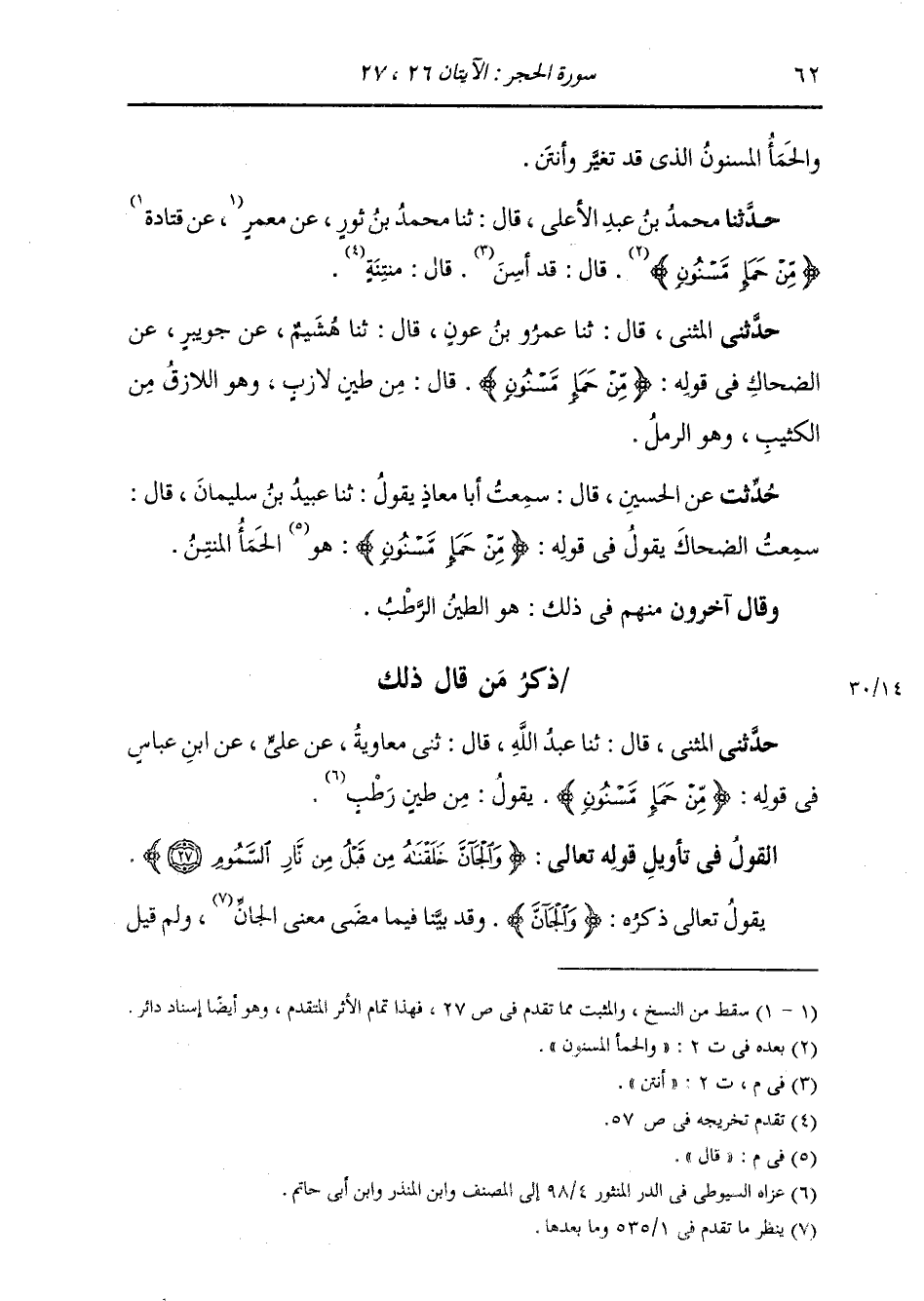 ذِكْرُ مَنْ قَالَ ذَلِكَ: حَدَّثَنِي الْمُثَنَّى، قَالَ: ثنا عَبْدُ اللَّهِ، قَالَ: ثني مُعَاوِيَةُ، عَنْ عَلِيٍّ، عَنِ ابْنِ عَبَّاسٍ، قَوْلُهُ: {§مِنْ حَمَإٍ مَسْنُونٍ} [الحجر: 26] يَقُولُ: «مِنْ طِينٍ رَطْبٍ»