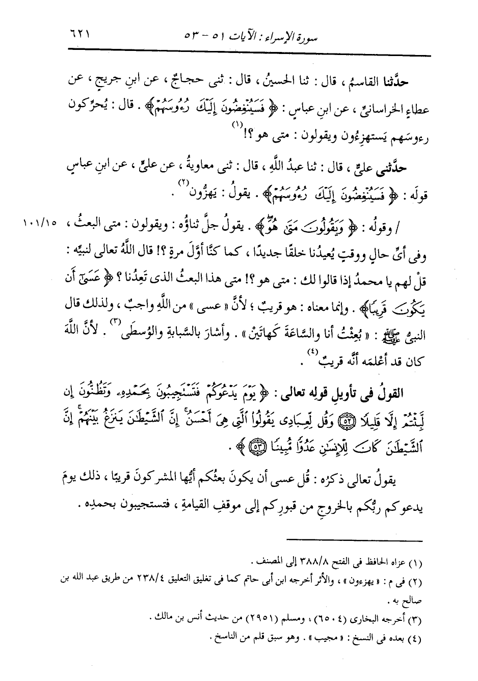 §الْقَوْلُ فِي تَأْوِيلِ قَوْلِهِ تَعَالَى: {يَوْمَ يَدْعُوكُمْ فَتَسْتَجِيبُونَ بِحَمْدِهِ وَتَظُنُّونَ إِنْ لَبِثْتُمْ إِلَّا قَلِيلًا وَقُلْ لِعِبَادِي يَقُولُوا الَّتِي هِيَ أَحْسَنُ إِنَّ الشَّيْطَانَ يَنْزَغُ بَيْنَهُمْ إِنَّ الشَّيْطَانَ كَانَ لِلإِنْسَانِ عَدُوًّا مُبِينًا} [الإسراء: 53] يَقُولُ تَعَالَى ذِكْرُهُ: قُلْ عَسَى أَنْ يَكُونَ بَعْثُكُمْ أَيُّهَا الْمُشْرِكُونَ قَرِيبًا، ذَلِكَ يَوْمَ يَدْعُوكُمْ رَبُّكُمْ بِالْخُرُوجِ مِنْ قُبُورِكُمْ إِلَى مَوْقِفِ الْقِيَامَةِ، فَتَسْتَجِيبُونَ بِحَمْدِهِ. -[622]- اخْتَلَفَ أَهْلُ التَّأْوِيلِ فِي مَعْنَى قَوْلِهِ: {فَتَسْتَجِيبُونَ بِحَمْدِهِ} [الإسراء: 52] فَقَالَ بَعْضُهُمْ: فَتَسْتَجِيبُونَ بِأَمْرِهِ