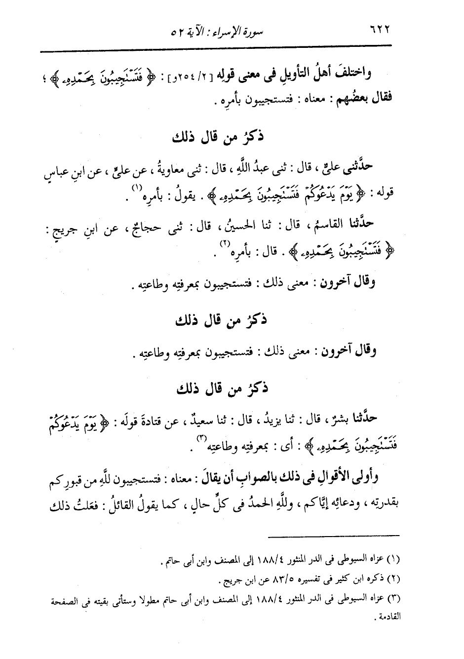 ذِكْرُ مَنْ قَالَ ذَلِكَ: حَدَّثَنِي عَلِيٌّ، قَالَ: ثني عَبْدُ اللَّهِ، قَالَ: ثني مُعَاوِيَةُ، عَنْ عَلِيٍّ، عَنِ ابْنِ عَبَّاسٍ، قَوْلِهِ: {§يَوْمَ يَدْعُوكُمْ فَتَسْتَجِيبُونَ بِحَمْدِهِ} [الإسراء: 52] يَقُولُ: بِأَمْرِهِ
