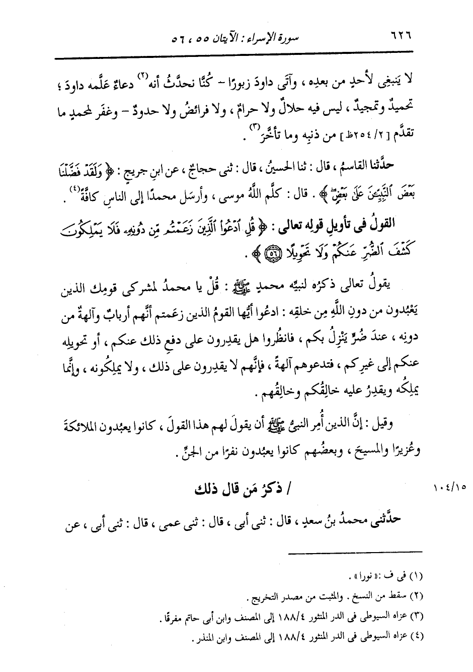 §الْقَوْلُ فِي تَأْوِيلِ قَوْلِهِ تَعَالَى: {قُلِ ادْعُوا الَّذِينَ زَعَمْتُمْ مِنْ دُونِهِ فَلَا يَمْلِكُونَ كَشْفَ الضُّرِّ عَنْكُمْ وَلَا تَحْوِيلًا} [الإسراء: 56] يَقُولُ تَعَالَى ذِكْرُهُ لِنَبِيِّهِ مُحَمَّدٍ صَلَّى اللهُ عَلَيْهِ وَسَلَّمَ: قُلْ يَا مُحَمَّدُ لِمُشْرِكِي قَوْمِكَ الَّذِينَ يَعْبُدُونَ مِنْ دُونِ اللَّهِ مِنْ خَلْقِهِ: ادْعُوا أَيُّهَا الْقَوْمُ الَّذِينَ زَعَمْتُمْ أَنَّهُمْ أَرْبَابٌ وَآلِهَةٌ مِنْ دُونِهِ عِنْدَ ضُرٍّ يَنْزِلُ بِكُمْ، فَانْظُرُوا هَلْ يَقْدِرُونَ عَلَى دَفْعِ ذَلِكَ عَنْكُمْ، أَوْ تَحْوِيلِهِ عَنْكُمْ إِلَى غَيْرِكُمْ، فَتَدْعُوهُمْ آلِهَةً، فَإِنَّهُمْ لَا يَقْدِرُونَ عَلَى ذَلِكَ، وَلَا يَمْلِكُونَهُ، وَإِنَّمَا يَمْلِكُهُ وَيَقْدِرُ عَلَيْهِ خَالِقُكُمْ وَخَالِقُهُمْ. وَقِيلَ: إِنَّ الَّذِينَ أُمِرَ النَّبِيُّ صَلَّى اللهُ عَلَيْهِ وَسَلَّمَ أَنْ يَقُولَ لَهُمْ هَذَا الْقَوْلَ كَانُوا يَعْبُدُونَ الْمَلَائِكَةَ وَعُزَيْرًا وَالْمَسِيحَ، وَبَعْضُهُمْ كَانُوا يَعْبُدُونَ نَفَرًا مِنَ الْجِنِّ