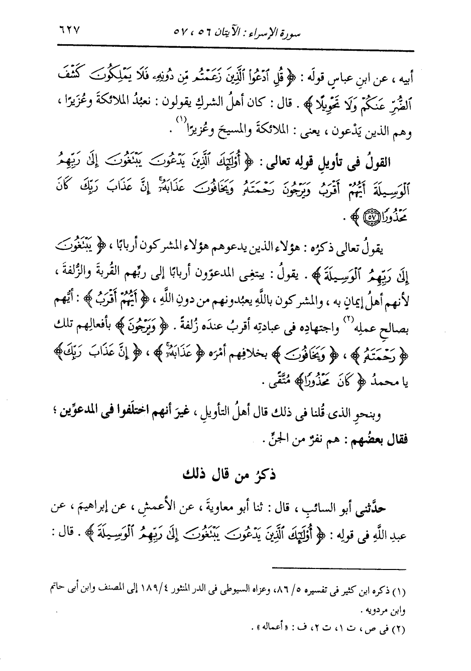 ذِكْرُ مَنْ قَالَ ذَلِكَ: حَدَّثَنِي أَبُو السَّائِبِ، قَالَ: ثنا أَبُو مُعَاوِيَةَ، عَنِ الْأَعْمَشِ، عَنْ إِبْرَاهِيمَ، عَنْ عَبْدِ اللَّهِ، فِي قَوْلِهِ: {§أُولَئِكَ الَّذِينَ يَدْعُونَ يَبْتَغُونَ إِلَى رَبِّهِمُ الْوَسِيلَةَ} [الإسراء: 57] قَالَ: -[628]- كَانَ نَاسٌ مِنَ الْإِنْسِ يَعْبُدُونَ قَوْمًا مِنَ الْجِنِّ، فَأَسْلَمَ الْجِنُّ وَبَقِيَ الْإِنْسُ عَلَى كُفْرِهِمْ، فَأَنْزَلَ اللَّهُ تَعَالَى {أُولَئِكَ الَّذِينَ يَدْعُونَ يَبْتَغُونَ إِلَى رَبِّهِمُ الْوَسِيلَةَ} [الإسراء: 57] يَعْنِي الْجِنَّ