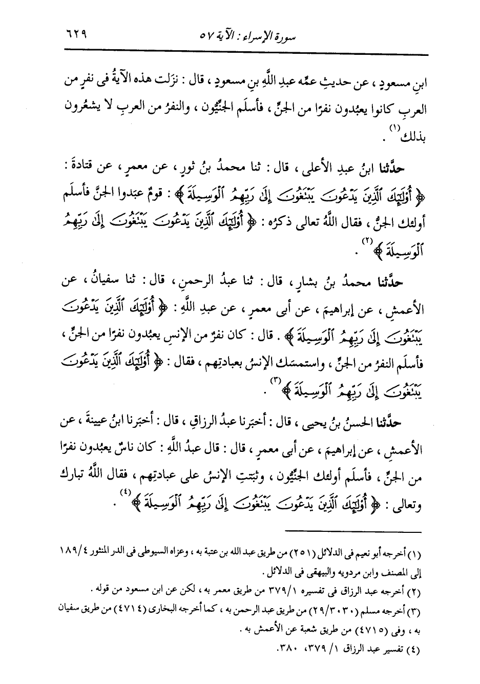 حَدَّثَنَا مُحَمَّدُ بْنُ بَشَّارٍ، قَالَ: ثنا عَبْدُ الرَّحْمَنِ، قَالَ: ثنا سُفْيَانُ، عَنِ الْأَعْمَشِ، عَنْ إِبْرَاهِيمَ، عَنْ أَبِي مَعْمَرٍ، عَنْ عَبْدِ اللَّهِ {§أُولَئِكَ الَّذِينَ يَدْعُونَ يَبْتَغُونَ إِلَى رَبِّهِمُ الْوَسِيلَةَ} [الإسراء: 57] قَالَ: كَانَ نَفَرٌ مِنَ الْإِنْسِ يَعْبُدُونَ نَفَرًا مِنَ الْجِنِّ، فَأَسْلَمَ النَّفَرُ مِنَ الْجِنِّ وَاسْتَمْسَكَ الْإِنْسُ بِعِبَادَتِهِمْ، فَقَالَ {أُولَئِكَ الَّذِينَ يَدْعُونَ يَبْتَغُونَ إِلَى رَبِّهِمُ الْوَسِيلَةَ} [الإسراء: 57]