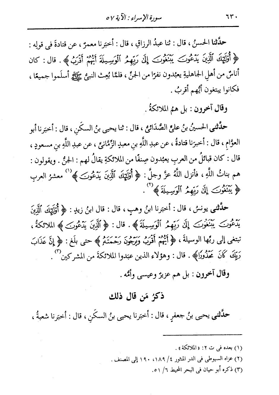 حَدَّثَنَا الْحَسَنُ، قَالَ: ثنا عَبْدُ الرَّزَّاقِ، قَالَ: أَخْبَرَنَا مَعْمَرٌ، عَنْ قَتَادَةَ، فِي قَوْلِهِ: {§أُولَئِكَ الَّذِينَ يَدْعُونَ يَبْتَغُونَ إِلَى رَبِّهِمُ الْوَسِيلَةَ أَيُّهُمْ أَقْرَبُ} [الإسراء: 57] قَالَ كَانَ أُنَاسٌ مِنْ أَهْلِ الْجَاهِلِيَّةِ يَعْبُدُونَ نَفَرًا مِنَ الْجِنِّ، فَلَمَّا بَعَثَ النَّبِيُّ صَلَّى اللهُ عَلَيْهِ وَسَلَّمَ أَسْلَمُوا جَمِيعًا، فَكَانُوا يَبْتَغُونَ أَيُّهُمْ أَقْرَبُ وَقَالَ آخَرُونَ: بَلْ هُمُ الْمَلَائِكَةُ