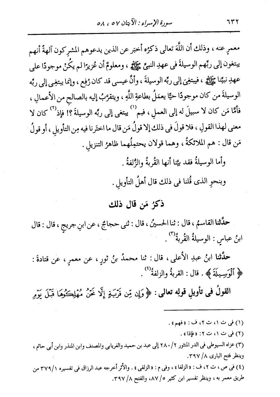 مَعْمَرٍ عَنْهُ، وَذَلِكَ أَنَّ اللَّهَ تَعَالَى ذِكْرُهُ أَخْبَرَ عَنِ الَّذِينَ يَدْعُوهُمُ الْمُشْرِكُونَ آلِهَةً أَنَّهُمْ يَبْتَغُونَ إِلَى رَبِّهِمُ الْوَسِيلَةَ فِي عَهْدِ النَّبِيِّ صَلَّى اللهُ عَلَيْهِ وَسَلَّمَ، وَمَعْلُومٌ أَنَّ عُزَيْرًا لَمْ يَكُنْ مَوْجُودًا عَلَى عَهْدِ نَبِيِّنَا عَلَيْهِ الصَّلَاةُ وَالسَّلَامُ فَيَبْتَغِي إِلَى رَبِّهِ الْوَسِيلَةَ وَأَنَّ عِيسَى قَدْ كَانَ رُفِعَ، وَإِنَّمَا يَبْتَغِي إِلَى رَبِّهِ الْوَسِيلَةَ مَنْ كَانَ مَوْجُودًا حَيًّا يَعْمَلُ بِطَاعَةِ اللَّهِ، وَيَتَقَرَّبُ إِلَيْهِ بِالصَّالِحِ مِنَ الْأَعْمَالِ. فَأَمَّا مَنْ كَانَ لَا سَبِيلَ لَهُ إِلَى الْعَمَلِ، فَبِمَ يَبْتَغِي إِلَى رَبِّهِ الْوَسِيلَةَ. فَإِذَا كَانَ لَا مَعْنَى لِهَذَا الْقَوْلِ، فَلَا قَوْلَ فِي ذَلِكَ إِلَّا قَوْلُ مَنْ قَالَ مَا اخْتَرْنَا فِيهِ مِنَ التَّأْوِيلِ، أَوْ قَوْلُ مَنْ قَالَ: هُمُ الْمَلَائِكَةُ، وَهُمَا قَوْلَانِ يَحْتَمِلُهُمَا ظَاهِرُ التَّنْزِيلِ. وَأَمَّا الْوَسِيلَةُ، فَقَدْ بَيَّنَّا أَنَّهَا الْقِرْبَةُ وَالزُّلْفَةُ. وَبِنَحْوِ الَّذِي قُلْنَا فِي ذَلِكَ، قَالَ أَهْلُ التَّأْوِيلِ
