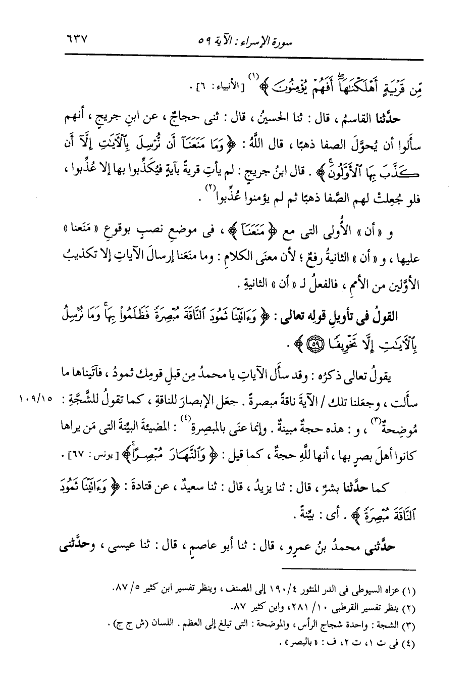 حَدَّثَنِي مُحَمَّدُ بْنُ عَمْرٍو، قَالَ: ثنا أَبُو عَاصِمٍ، قَالَ: ثنا عِيسَى، وَحَدَّثَنِي -[638]- الْحَارِثُ، قَالَ: ثنا الْحَسَنُ، قَالَ: ثنا وَرْقَاءُ، جَمِيعًا عَنِ ابْنِ أَبِي نَجِيحٍ، عَنْ مُجَاهِدٍ، فِي قَوْلِ اللَّهِ عَزَّ ذِكْرُهُ {§النَّاقَةَ مُبْصِرَةً} [الإسراء: 59] قَالَ: آيَةً حَدَّثَنَا الْقَاسِمُ، قَالَ: ثنا الْحُسَيْنُ، قَالَ: ثني حَجَّاجٌ، عَنِ ابْنِ جُرَيْجٍ، عَنْ مُجَاهِدٍ، مِثْلَهُ