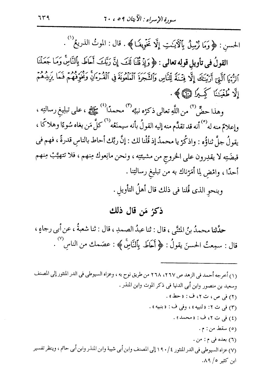 §الْقَوْلُ فِي تَأْوِيلِ قَوْلِهِ تَعَالَى: {وَإِذْ قُلْنَا لَكَ إِنَّ رَبَّكَ أَحَاطَ بِالنَّاسِ وَمَا جَعَلْنَا الرُّؤيَا الَّتِي أَرَيْنَاكَ إِلَّا فِتْنَةً لِلنَّاسِ وَالشَّجَرَةَ الْمَلْعُونَةَ فِي الْقُرْآنِ وَنُخَوِّفُهُمْ فَمَا يَزِيدُهُمْ إِلَّا طُغْيَانًا كَبِيرًا} [الإسراء: 60] وَهَذَا حَضٌّ مِنَ اللَّهِ تَعَالَى ذِكْرُهُ نَبِيَّهُ مُحَمَّدًا صَلَّى اللهُ عَلَيْهِ وَسَلَّمَ، عَلَى تَبْلِيغِ رِسَالَتِهِ، وَإِعْلَامٌ مِنْهُ أَنَّهُ قَدْ تَقَدَّمَ مِنْهُ إِلَيْهِ الْقَوْلُ بِأَنَّهُ سَيَمْنَعُهُ مِنْ كُلِّ مَنْ بَغَاهُ سُوءًا وَهَلَاكًا، يَقُولُ جَلَّ ثَنَاؤُهُ: وَاذْكُرْ يَا مُحَمَّدُ إِذْ قُلْنَا لَكَ إِنَّ رَبَّكَ أَحَاطَ بِالنَّاسِ قُدْرَةً، فَهُمْ فِي قَبْضَتِهِ لَا يَقْدِرُونَ عَلَى الْخُرُوجِ مِنْ مَشِيئَتِهِ، وَنَحْنُ مَانِعُوكَ مِنْهُمْ، فَلَا تَتَهَيَّبْ مِنْهُمْ أَحَدًا، وَامْضِ لِمَا أَمَرْنَاكَ بِهِ مِنْ تَبْلِيغِ رِسَالَتِنَا. وَبِنَحْوِ الَّذِي قُلْنَا فِي ذَلِكَ، قَالَ أَهْلُ التَّأْوِيلِ