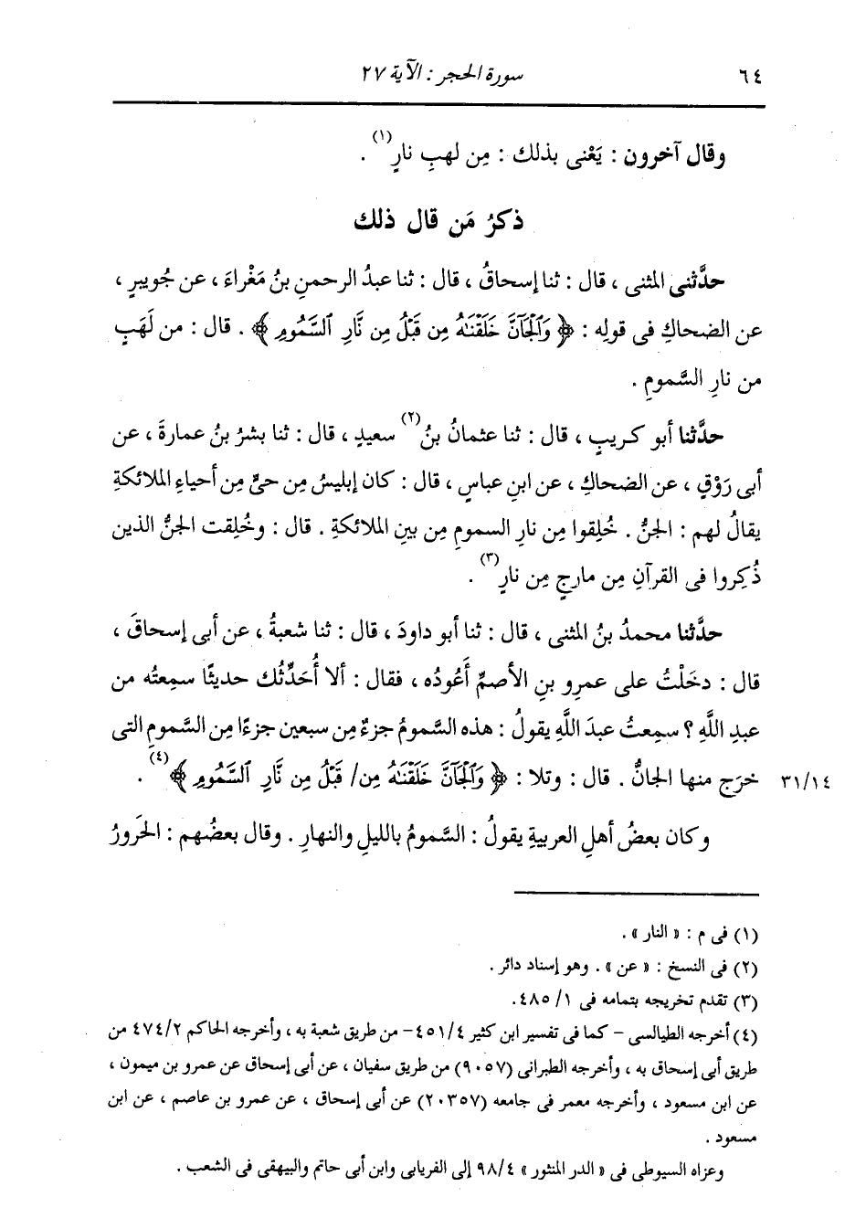 حَدَّثَنَا مُحَمَّدُ بْنُ الْمُثَنَّى، قَالَ: ثنا أَبُو دَاوُدَ، قَالَ: ثنا شُعْبَةُ، عَنْ أَبِي إِسْحَاقَ، قَالَ: دَخَلْتُ عَلَى عَمْرِو بْنِ الْأَصَمِّ أَعُودُهُ، فَقَالَ: أَلَا أُحَدِّثُكَ حَدِيثًا سَمِعْتُهُ مِنْ عَبْدِ اللَّهِ؟ سَمِعْتُ عَبْدَ اللَّهِ، يَقُولُ: «§هَذِهِ السَّمُومُ جُزْءٌ مِنْ سَبْعِينَ جُزْءًا مِنَ السَّمُومِ الَّتِي خَرَجَ مِنْهَا الْجَانُّ» قَالَ: وَتَلَا: {وَالْجَانَّ خَلَقْنَاهُ مِنْ قَبْلُ مِنْ نَارِ السَّمُومِ} [الحجر: 27] " وَكَانَ بَعْضُ أَهْلِ الْعَرَبِيَّةِ يَقُولُ: السَّمُومُ بِاللَّيْلِ وَالنَّهَارِ، وَقَالَ بَعْضُهُمْ: الْحَرُورُ -[65]- بِالنَّهَارِ، وَالسَّمُومُ بِاللَّيْلِ، يُقَالُ: سَمَّ يَوْمُنَا يَسَمُّ سَمُومًا
