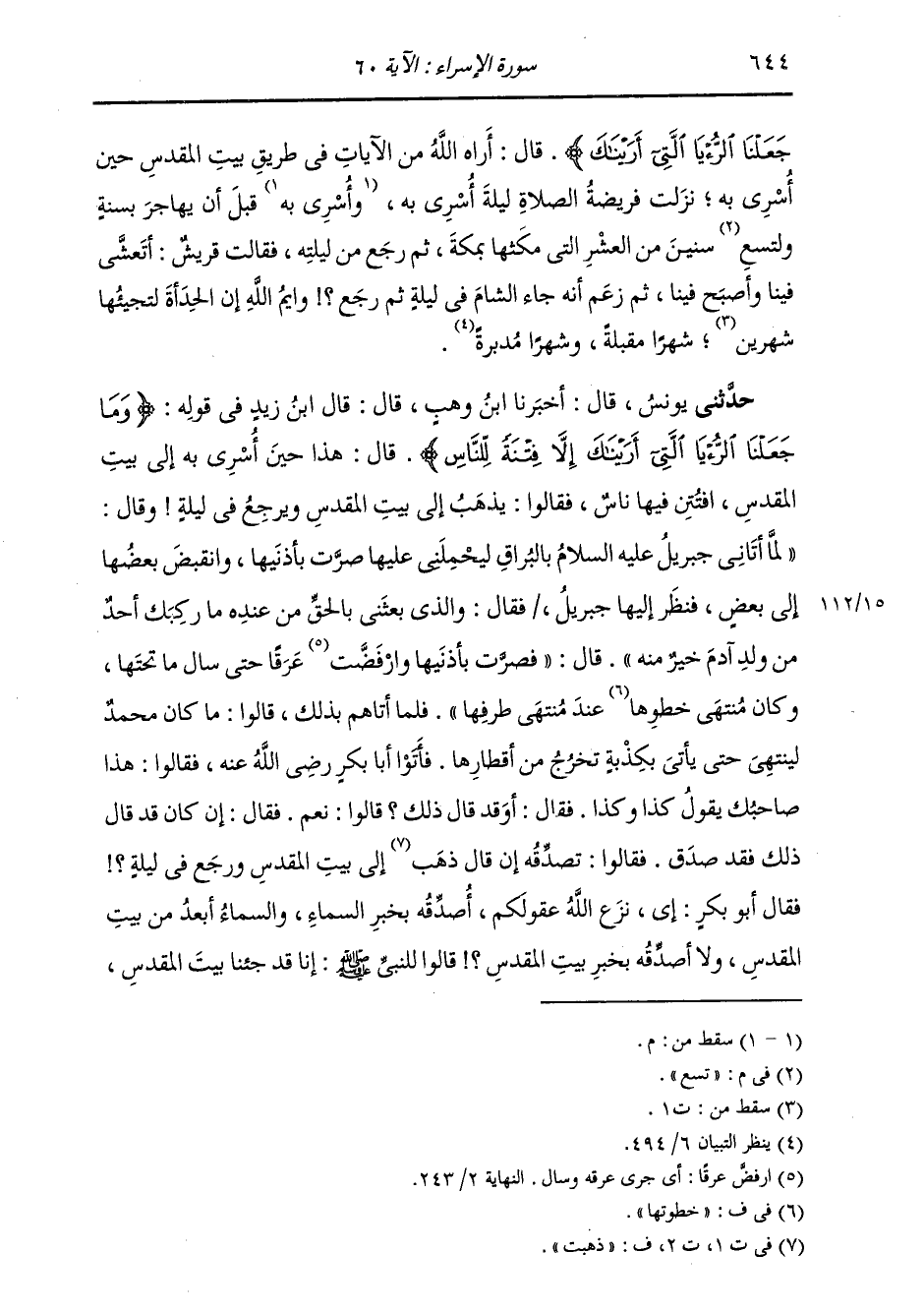 حَدَّثَنِي يُونُسُ، قَالَ: أَخْبَرَنَا ابْنُ وَهْبٍ، قَالَ: قَالَ ابْنُ زَيْدٍ، فِي قَوْلِهِ {§وَمَا جَعَلْنَا الرُّؤْيَا الَّتِي أَرَيْنَاكَ إِلَّا فِتْنَةً لِلنَّاسِ} [الإسراء: 60] قَالَ: هَذَا حِينَ أُسْرِيَ بِهِ إِلَى بَيْتِ الْمَقْدِسِ، افْتُتِنَ فِيهَا نَاسٌ، فَقَالُوا: يَذْهَبُ إِلَى بَيْتِ الْمَقْدِسِ وَيَرْجِعُ فِي لَيْلَةٍ